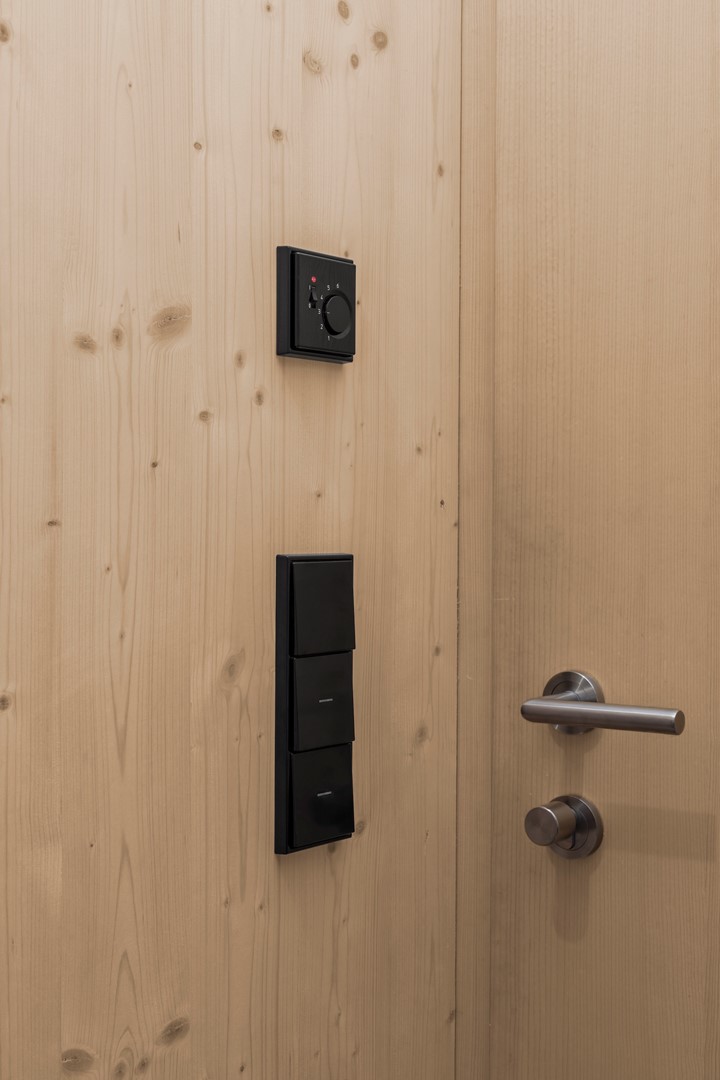 De zwarte LS 990-schakelaars van JUNG zijn in dit project bewust ingezet als grafische accenten. Tegen de lichte houttinten vormen ze een helder contrast, waarbij functionaliteit en vormgeving samenkomen. De schakelaars voegen zich in het lijnenspel van het interieur en versterken de architectonische helderheid van de ruimte.