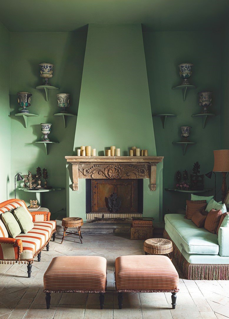 Het is een bescheiden omschrijving van een project dat jaren duurde, want wat begon met het selecteren van de juiste kleur groen groeide beetje bij beetje uit tot een algehele restyling van de vertrekken. Zo besloot Andrea de hoofdsteunen van de bedden in de gastenslaapkamer, eerst voorzien van een verkleurde stof, opnieuw te laten bekleden met een frisser, gestreept textiel. Voor een andere slaapkamer ontwierp hij twee prachtige spiegels, in de vorm van Arabische ramen, waarachter twee kledingkasten verborgen gaan. Voor de wanden in dezelfde ruimte koos hij een mintgroen, dezelfde kleur waarmee hij de lampenkapjes opnieuw bekleden liet.