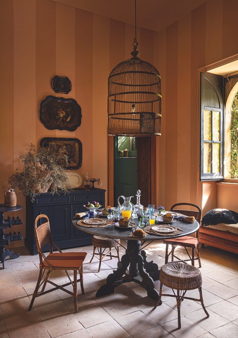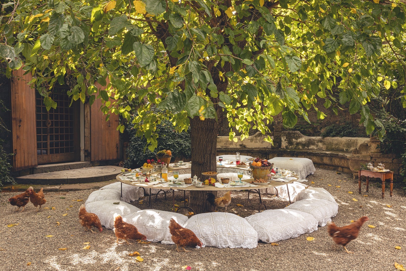 Of, zoals Andrea het eerder noemde, ‘er een draai aan te geven’. Zo maakte hij uit metalen matrassteunen waarop men vroeger, gedurende de winter, de matrassen verticaal positioneerde, de basis voor een lage tafel rondom een moerbeiboom op de binnenplaats. ‘Een ring van zitkussens er omheen, alles afgedekt met antieke, geborduurde kleden uit de linnenkast van het kasteel, een mooi servies, rondscharrelende kippetjes … het is perfect voor een ontbijt in de schaduw met vrienden.’