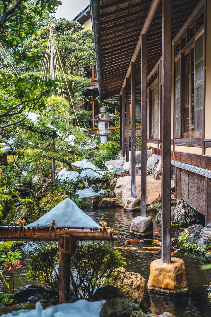 Nishimuraya Honkan, een van de oudste en meest verfijnde ryokans van Japan, is een bestemming op zich. Bij aankomst valt meteen de binnentuin op: een zorgvuldig gecomponeerd landschap van mos, bonsai en vijvers waarin kleurrijke karpers zich traag voortbewegen.