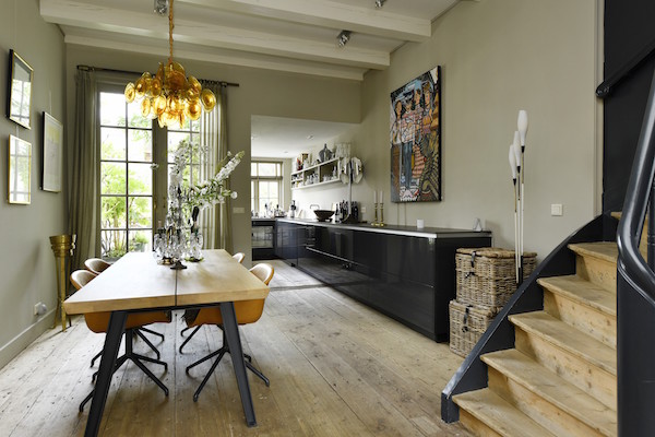 op twee plaatsen. Via de eigen opgang bereikt u de bovengelegen woning bestaande uit drie lagen. Op de eerste verdieping is de woonkamer gesitueerd met open keuken. Het huis is in zijn geheel zeer smaakvol ingericht en de karakteristieke kenmerken zoals de houten vloeren en de balken in het zicht zijn behouden. Aan de voorzijde is de zitkamer en aan de achterkant van de eerste verdieping is de keuken gelegen. Het is een moderne strakke keuken voorzien van Smeg-inbouwapparatuur. Tevens kunt u vanuit de woonkamer het dakterras op via openslaande deuren. Dit is ook een van de favoriete plekken in huis van de huidige bewoners om tijdens de zomermaanden te genieten van ontbijt op het terras.