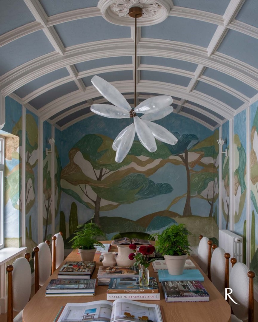 Hoewel ze prachtig zijn, vond ik de lambrisering nogal mannelijk en zwaar. Om dat te compenseren hebben we de plafonds en muren beschilderd met delicate natuurtaferelen en mystieke wezens, alsof het leven uit de panelen kruipt. En in plaats van een centrale lamp – te voor de hand liggend in een gekaderd plafond – hangt er nu een oversized parelsnoer dat eerder lijkt op een kunstwerk dan op een verlichtingsarmatuur. Als contrast voor de vierkante lijnen in de ruimte, is het meubilair zacht en rond met aaibare stoffen.’