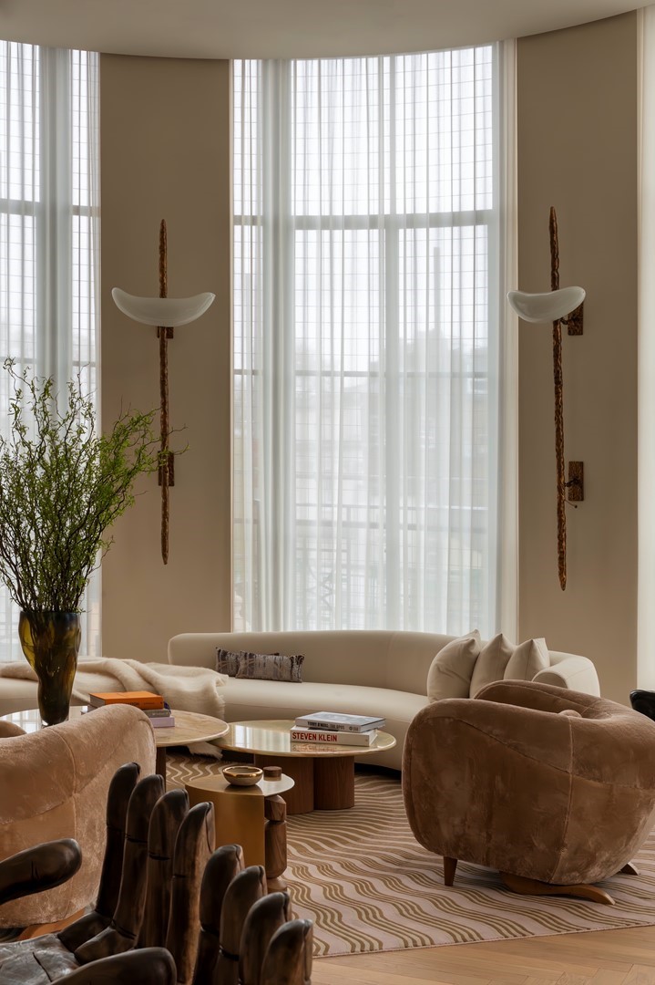 Naast kleur en materiaal speelt kunst een belangrijke rol. Behun koos zorgvuldig voor een mix van schilderijen, sculpturen en objecten die de ruimtes accentueren en voor visuele verrassingen zorgen. ‘Ik wil dat mensen binnenkomen en meteen het gevoel hebben dat de ruimte van hen is’, aldus de designer. ‘Hoewel het interieur helemaal uit mijn verbeelding is ontstaan, moet het wel aanvullen als een huis waarin je wilt wonen; uitnodigend en warm. Elk detail is onderdeel van een groter verhaal dat het erfgoed van het gebouw verbindt met de actualiteit van het stadsleven.’
