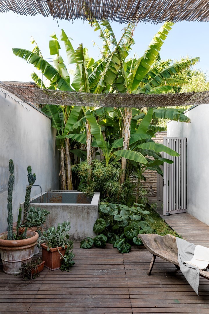 Een geheime tuin vol tropische planten, dat verwacht je niet zo snel in een rauwe, hippe wijk van Rome. Roberta Paolucci en Paolo Giacomelli, het tegendraadse duo achter sieradenmerk Iosselliani, maakten van hun huis een exotisch lustoord.