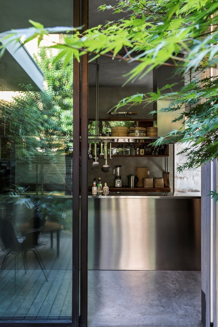 De keuken is open en licht en biedt uitzicht op beide zijden van de tuin. Weinig deuren en veel glas, dat is waar het creatieve duo de voorkeur aan geeft. ‘Toen we de indeling van het huis gingen bepalen, wilden we dat de keuken het kloppend hart zou worden, zoals de Italiaanse traditie dicteert’, aldus Paolucci. ‘Het middelpunt van de aandacht, als een kathedraal met een magnetische aantrekkingskracht. We koken graag, al is Paolo er beter in dan ik.’