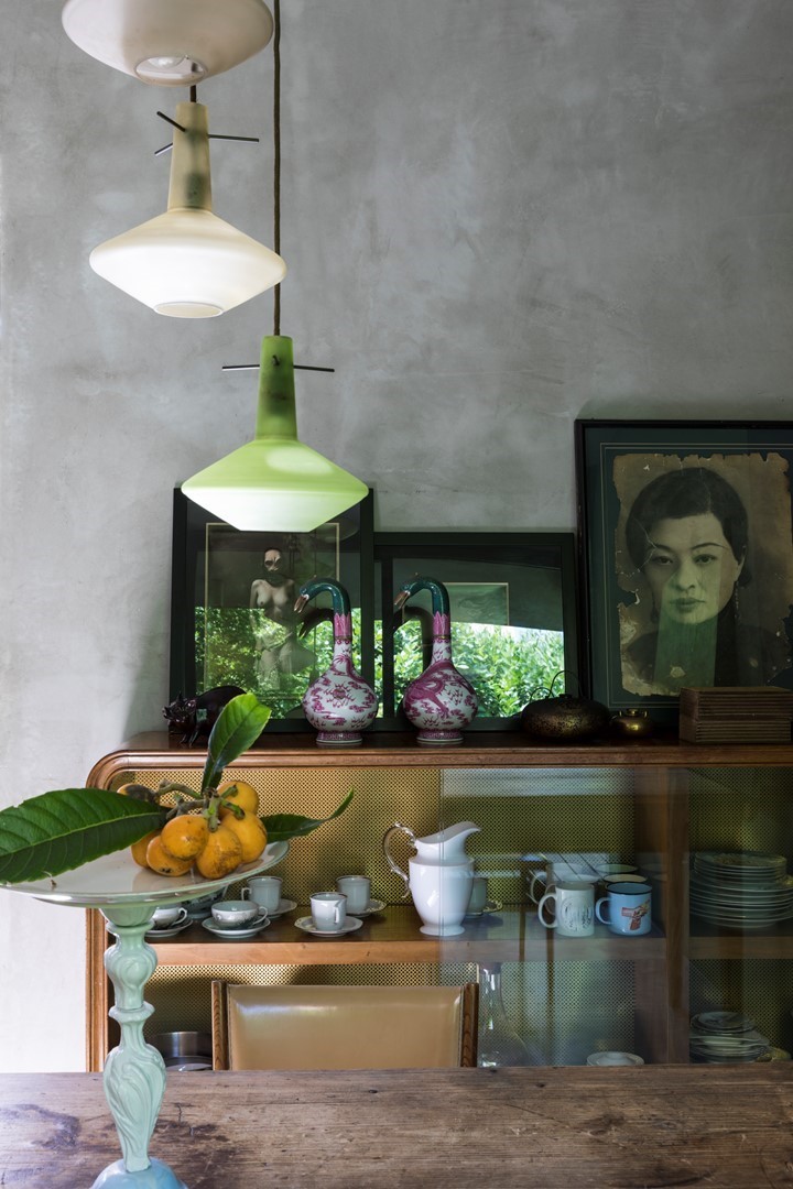 Het huis, dat een paar jaar geleden werd gebouwd, weerspiegelt hun liefde voor architectuur. De ruimtes fungeren als een minimalistische basis voor hun eigenzinnige interieurstijl. Vintage lampen, een rustieke houten tafel afkomstig uit een oud klooster, objecten uit Mexico en China, kunst van de Amerikaanse fotograaf Nan Goldin – het komt allemaal samen in een eclectische mix.