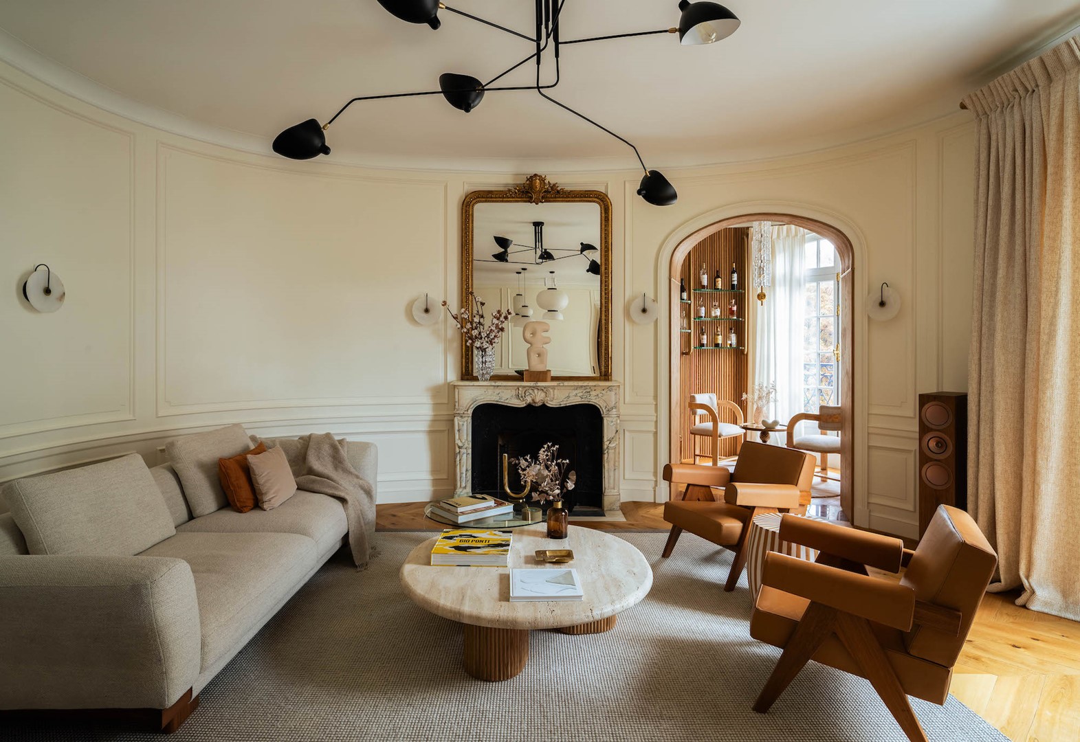 Een appartement in een van deze panden, gesitueerd op een steenworp afstand van het bekende monument, kwam in bezit van een jong Parijs’ stel. Het ging om een woning van 270 vierkante meter met een reeks opeenvolgende kamers, royaal qua afmeting en met hoge plafonds. Potentieel fijne kamers, maar voordat binnenhuisarchitect Alexandra Saguet van AS Interior Design er binnenstapte ongezellig en oubollig. Het was duidelijk dat ze een manier moest vinden om de ruimtes qua atmosfeer warmer en persoonlijker te maken en het appartement door middel van natuurlijke materialen en kleuren weer te veranderen in de plezierige woning die het eind negentiende eeuw ongetwijfeld was geweest. Helaas was er weinig interessants om op voort te borduren, behalve het feit dat de woonkamer licht gebogen wanden met lambrisering had, een karakteristiek element in de Haussmann-architectuur.