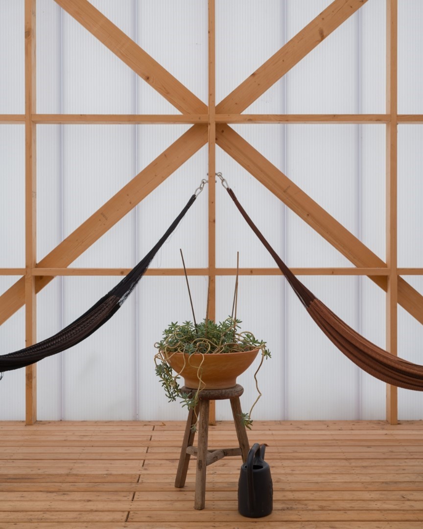 Güldenhof is een historisch complex met een uitgesproken karakter. De stenen muren uit de achttiende eeuw bleven staan, maar daarbinnen werd vernieuwd en opnieuw gebouwd. Nieuw en oud bestaan naast elkaar, zichtbaar en bewust. Die spanning, tussen geschiedenis en ingreep, echoot in Vo’s werk, waarin objecten uit verschillende tijden met elkaar in dialoog gaan.