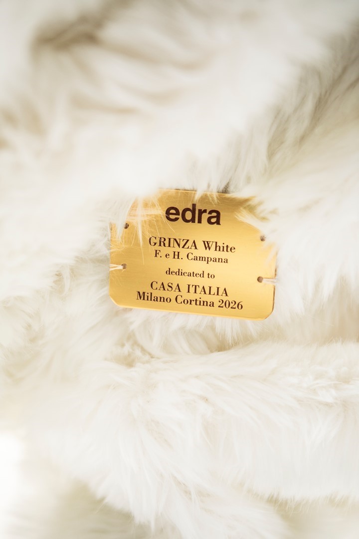 Speciaal voor deze gelegenheid ontwikkelde Edra een nieuwe uitvoering van de stoel Grinza, ontworpen door Estudio Campana. De Grinza White is volledig met de hand gemaakt en bekleed met wit ecobont. Volgens Edra roept het lichte, zachte en zuiver witte materiaal de zachtheid van sneeuw op, vertaald naar een warm en omhullend zitgevoel.