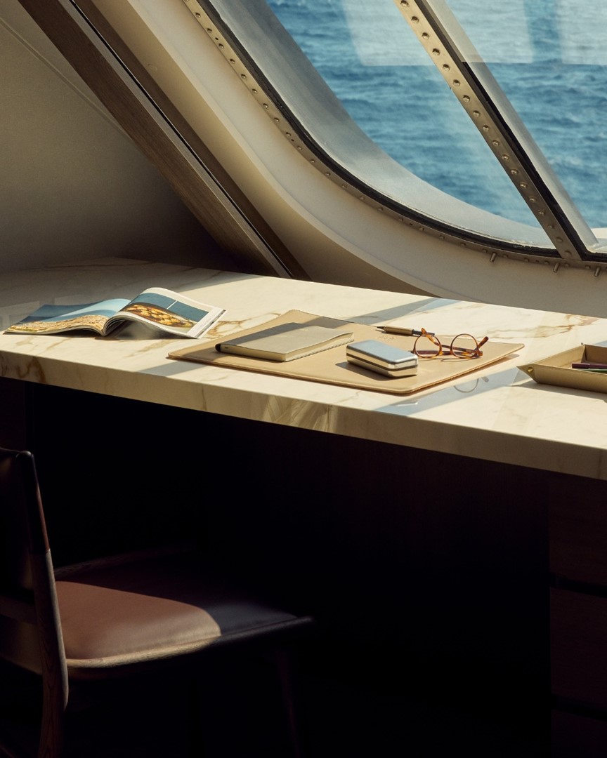 Centraal in de ervaring staan de suites: royale, lichte ruimtes met een privéterras en een continue verbinding met de oceaan. Alles is gericht op rust, overzicht en het gevoel van vrijheid dat hoort bij reizen over zee.