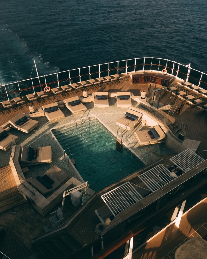 Met meer dan 2.500 vierkante meter aan open dekruimte is er volop gelegenheid om te ontspannen en te genieten van het uitzicht. Het schip beschikt over vier zwembaden, waaronder één met een uitschuifbaar glazen dak, vierenzestig privécabana’s, zonnedekken en bars waar lichte gerechten en cocktails worden geserveerd.