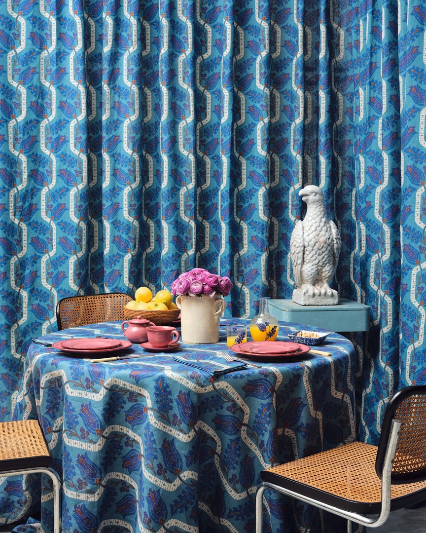 Ook interieurontwerper David Hicks was niet vies van een vrolijke print. Vanaf de jaren zestig werd hij wereldberoemd door zijn gedurfde kleurcombinaties. Hij bracht verschillende boeken daarover uit, waarvan de illustraties ironisch genoeg zwart-wit waren. Kleuren die een levendig verhaal vertellen. Cabana brengt dit jaar een koffietafelboek uit over de legende, met daarnaast de David Hicks-collectie vol kleurrijke en rijkelijk gedecoreerde items voor op tafel. Veelal met bloemmotieven. En meer studio’s grijpen terug naar archieven. Pierre Frey met Collection Anniversaire 1823-2023, de grootste collectie van Pierre Frey tot dusver. Little Greene dat Britse landhuizen afstruint naar de mooiste bebloemde prints en Allyson McDermott Collections dat onlangs een behang lanceerde geïnspireerd op het Royal Pavilion in Brighton: be-hang dat onder koningin Victoria zelfs een tijdje in Buckingham Palace heeft gehangen.