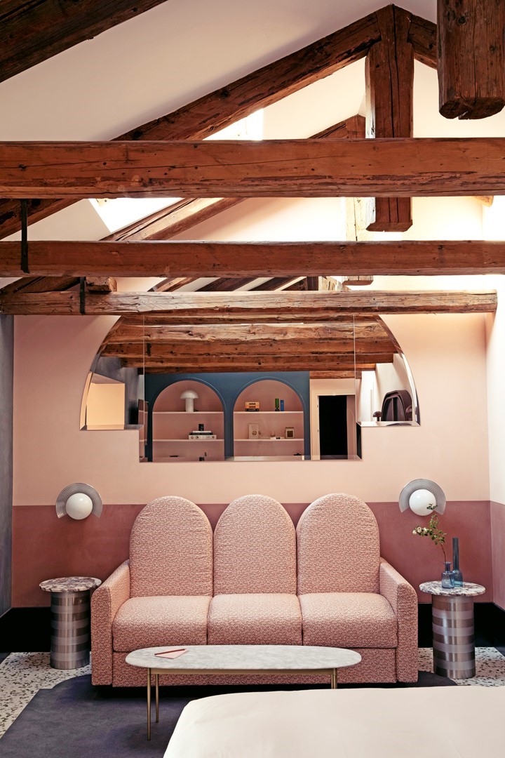 Dit alles is te danken aan de Franse architecte (en creatief partner van de Experimental Group) Dorothée Meilichzon die met haar studio Chzon alle interieurs van het elftal hotels ontwierp. Maar in het Venetiaanse etablissement besloot Meilichzon één ruimte, de cocktailbar om precies te zijn, uit te besteden aan een beroemde vriendin en collega: de Italiaanse ontwerpster Cristina Celestino, die -het zal geen toeval zijn- architectuur in Venetië studeerde. Zij liet zich op haar beurt inspireren door de Venetiaanse architect Carlo Scarpa en koos voor dieprode wanden in de traditionele Venetiaanse pleistertechniek, touwvormige lijsten (*Torchon) en een elegante toog in drie verschillende kleuren marmer. Een prachtige bar, met een grijsgroen gestreept tapijt en juweelachtige verlichting in een van de oudste en met historie beladen panden van de Serenissima.