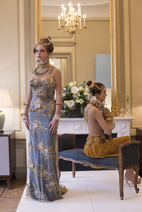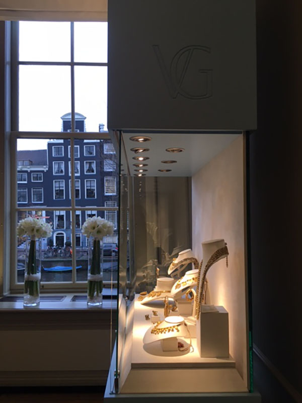 ‘We zijn voor de opening afgelopen donderdag een samenwerking aangegaan met couturier Edwin Oudshoorn. Zijn collectie heeft eigenlijk als een soort canvas gediend voor onze juwelen. Twee modellen droegen zowel zijn creaties als onze collectie. Het is een versmelting geweest van twee werelden. Daarbij zie je ook dat onze juwelen een heel erg fashionable component in zich hebben. Dat is ook waar wij in geloven en waarop we ons gaan richten. Wij willen onze traditionele juwelen, die ook een kunsthistorische- en een beleggingswaarde hebben, laten versmelten met de wereld van couture en hoogwaardige fashion. We zien daar een gat en willen daarin springen. We zijn met Edwin in gesprek geraakt en zijn door elkaars collectie gegaan. We vertrouwden heel erg op elkaar. Oorbellen werden op schouderstukken en in mouwen geprikt, sieraden in het haar…het was een spectaculair beeld.’