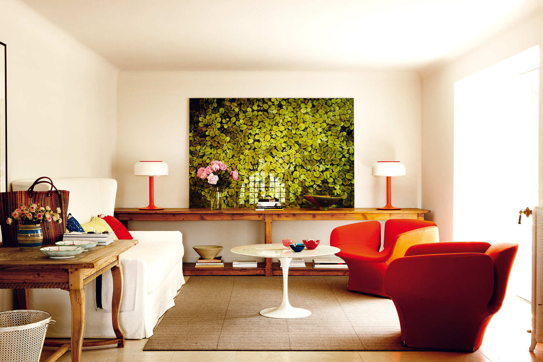 Wit is als basis gekozen in dit interieur. Alle muren en plafonds zijn wit, waardoor de felkleurige meubels en accessoires extra opvallen. Vooral het groenkleurige kunstwerk valt bij binnenkomst in het oog. De kleuren die gebruikt worden wijken af van de originele