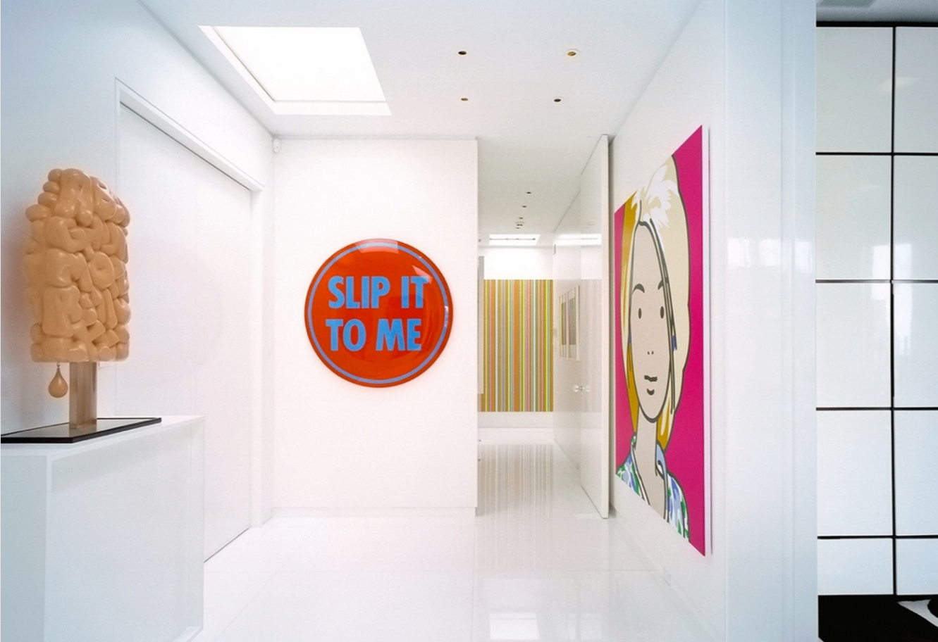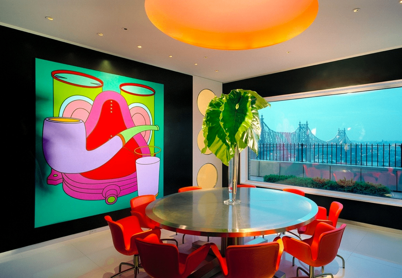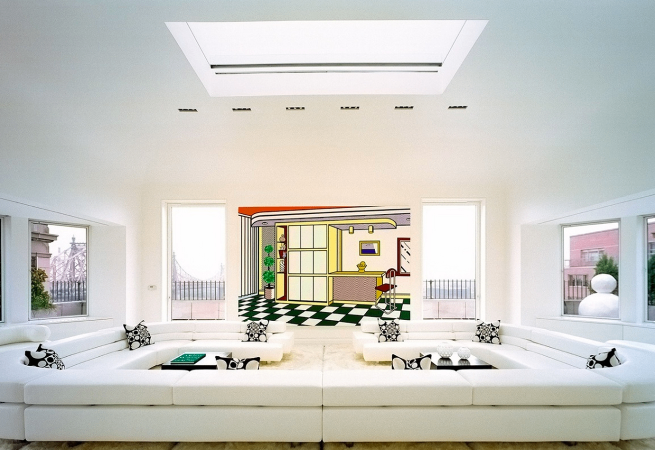 De architecten van het New Yorkse bureau 1100: transformeerden het van origine sierlijke midtown penthouse in een opvallende, minimalistische ruimte die de moderne stijl van de bewoners weerspiegelt. Elke beslissing die zij maakten onderstrepen het gevoel van popart, gevormd door de kunstenaars uit deze stijlperiode. Werken die in het interieur te zien zijn komen van Warhol, Riley, Lichtenstein en vele anderen.