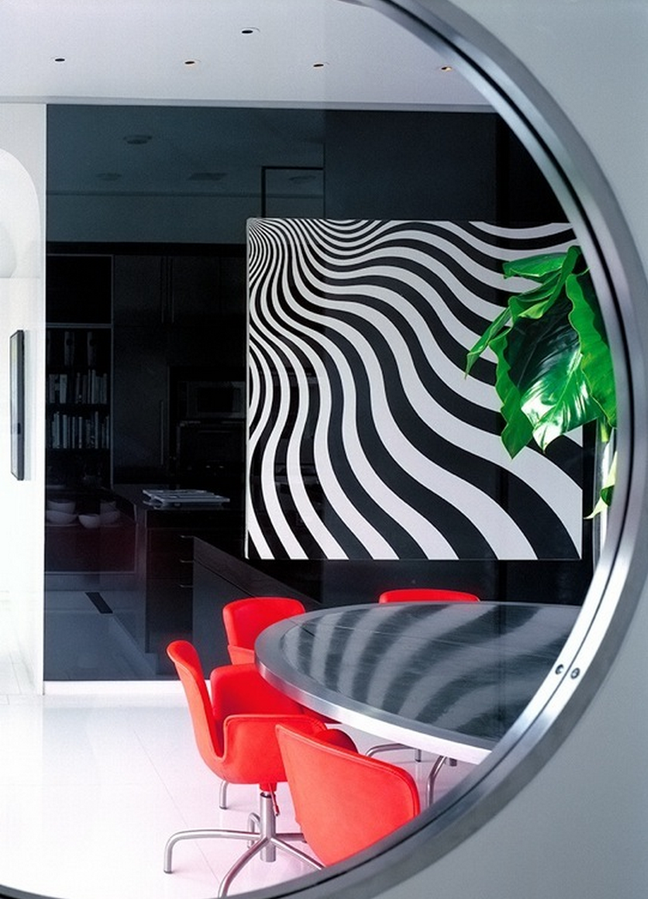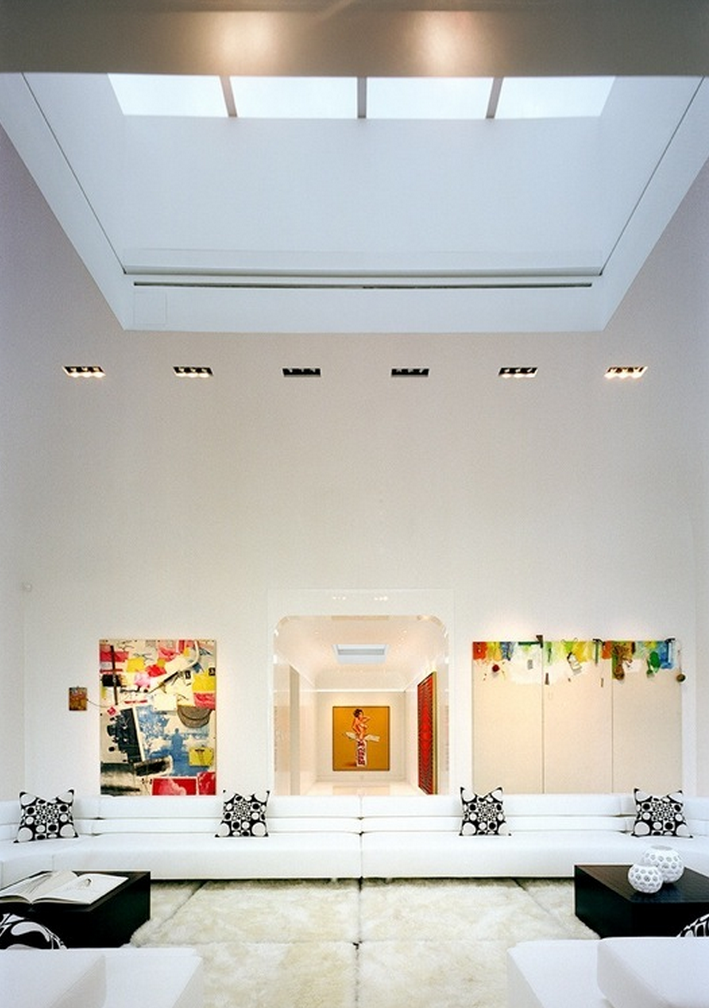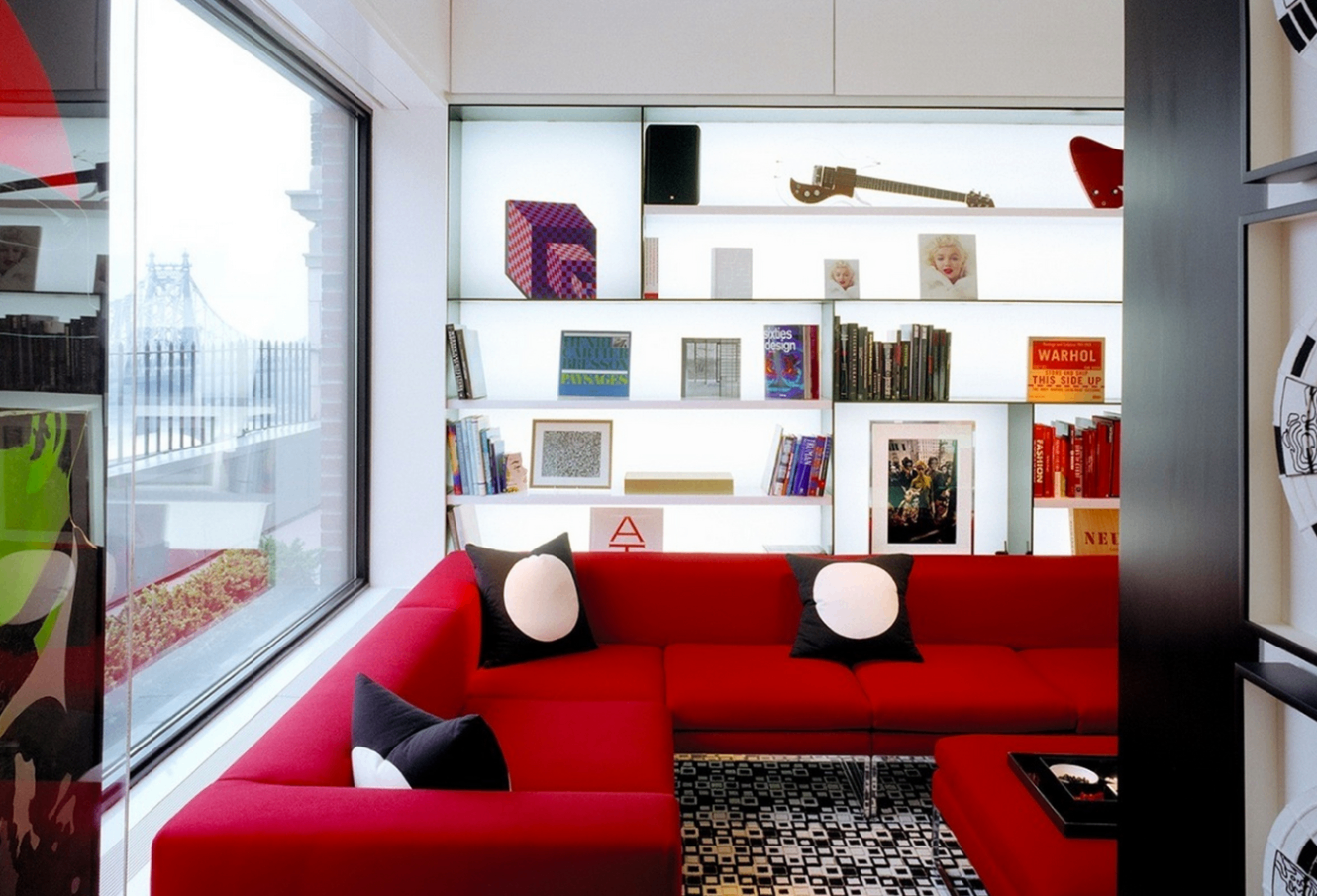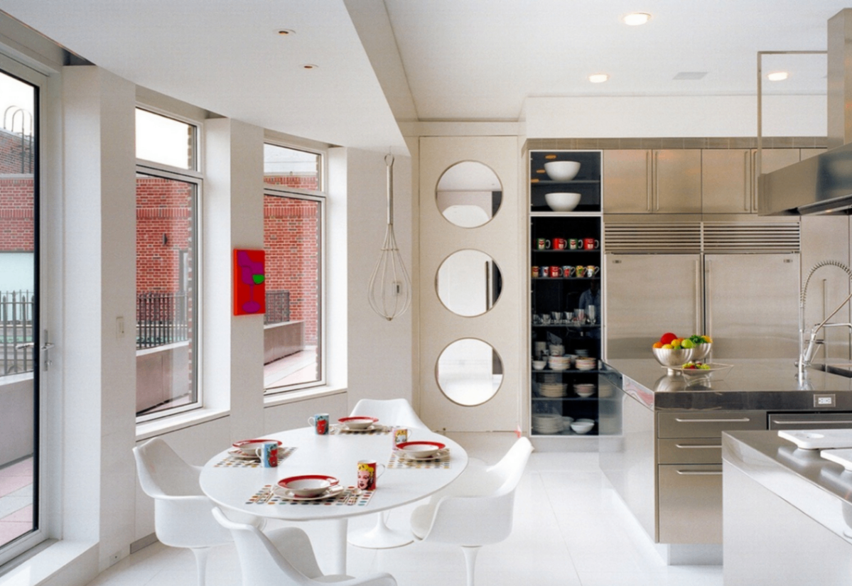 De architecten van het New Yorkse bureau 1100: transformeerden het van origine sierlijke midtown penthouse in een opvallende, minimalistische ruimte die de moderne stijl van de bewoners weerspiegelt. Elke beslissing die zij maakten onderstrepen het gevoel van popart, gevormd door de kunstenaars uit deze stijlperiode. Werken die in het interieur te zien zijn komen van Warhol, Riley, Lichtenstein en vele anderen.