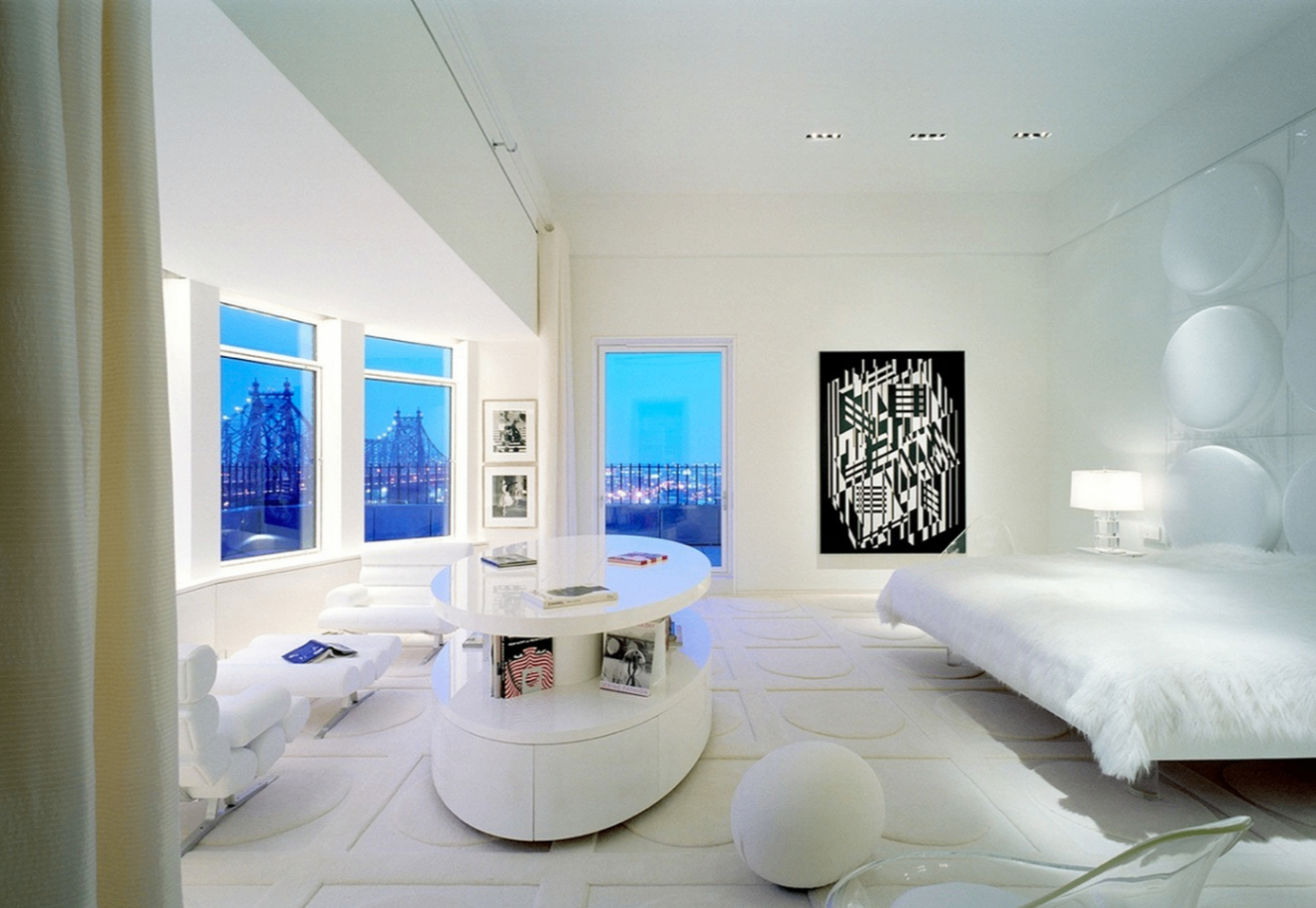 Opmerkelijk aan het interieur is de manier waarop de wanden in een vloeiende lijn in het plafond overlopen. Door deze vloeiende lijnen lijken de verschillende ruimtes naadloos in elkaar over te lopen. Relatief smalle gangen lopen vloeiend over in de centraal gelegen keuken bijvoorbeeld, of de blikvanger van het appartement; de twaalf meter brede woonkamer. Grote ramen bieden uitzicht op de 59th Street Bridge bieden. De opstelling van de meubels in het interieur is geïnspireerd op gesprekken in zitkuilen uit de jaren zestig. (Wist je trouwens dat zitkuilen weer helemaal terugkomen? Doe hier je