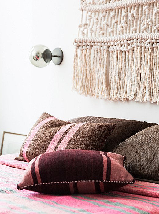 gekleurde sierkussens en het verzadigd roze plaid eruit. De kussens komen bijna in elke kamer terug. Deze vintage accessoires zijn gemaakt van Berber tapijten, een van de vele vondsten van Chaplin uit het buitenland. De prent van de Engelse schilder Sir William Flint, een familiestuk, is een van de weinige ingelijste