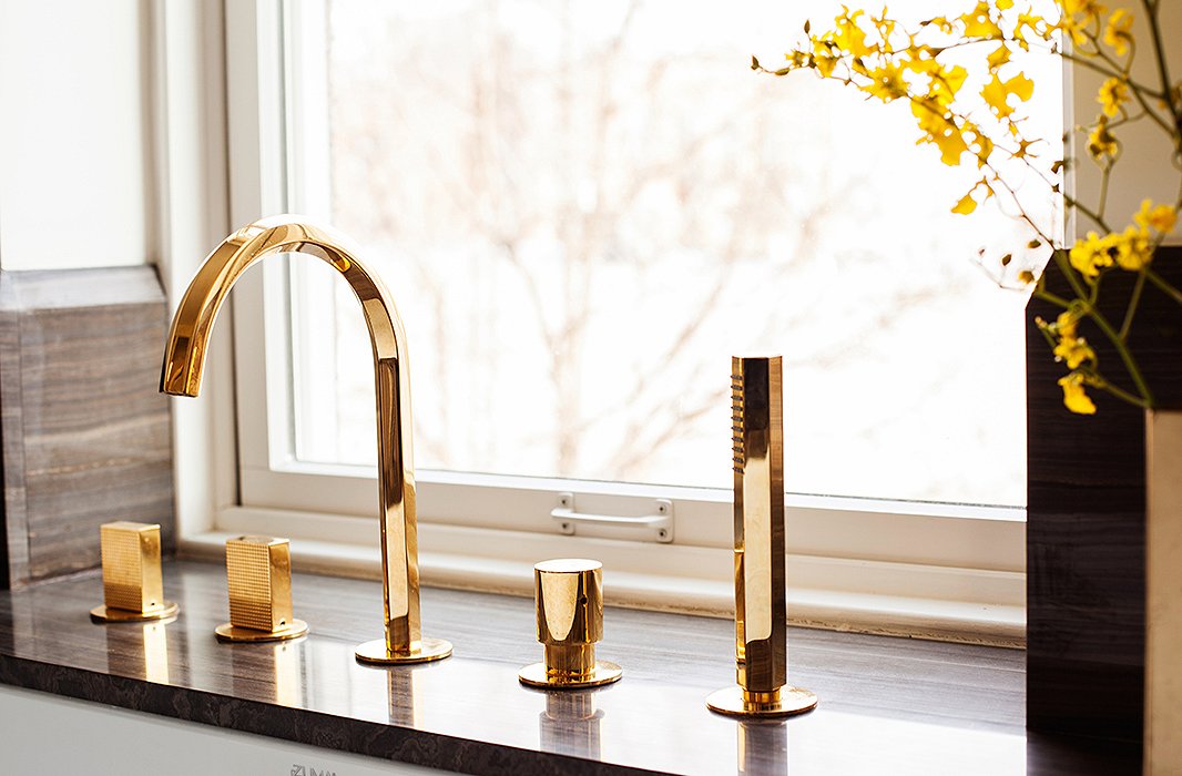 de badkamer uit de jaren twintig, dertig en zeventig. Vintage en disco, gebundeld in één ruimte. Haar architect koos voor chocolade marmer, met de hand geselecteerd uit een steengroeve in Brooklyn. De armaturen zijn van Fantini Rubinetti en de geweven prullenbak komt uit Mexico. Vanuit het bad kan Chaplin haar collectie schelpen bewonderen, die ze meeneemt vanuit verre bestemmingen, zoals de Gili eilanden, Tortola en Bahia. ‘Ze zijn niet van museumkwaliteit, maar ik vind het geweldig om schelpen als souvenir mee te nemen.’