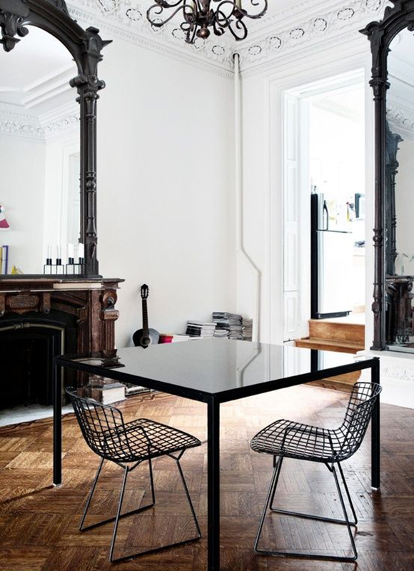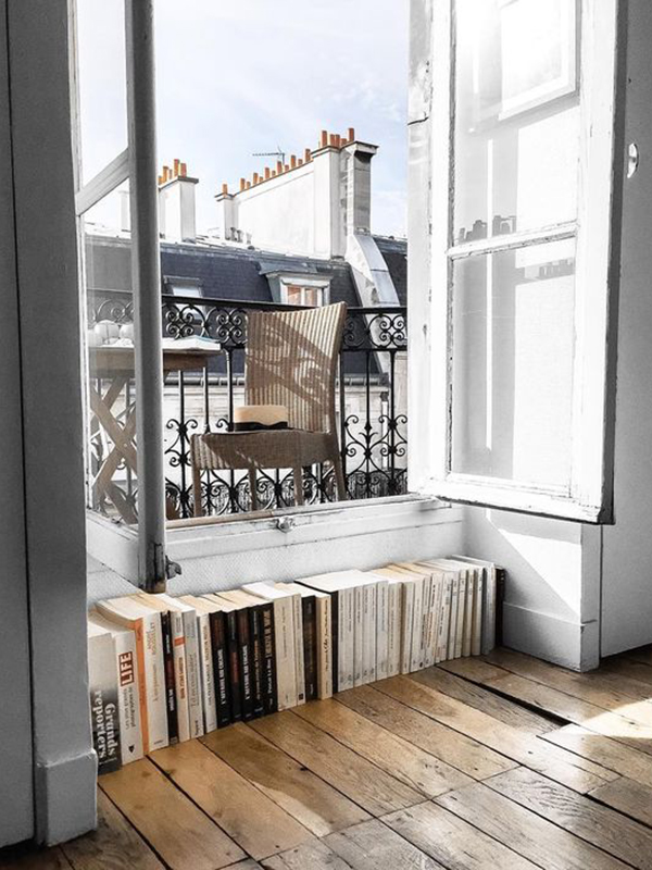 Marie-Antoinette gevoel als je naar boven kijkt. Historische houtsnijwerken dragen bij aan dit gevoel en worden door Parijzenaars juist behouden in plaats van verwijderd. Door de muren wit te laten komen deze oude architectonische elementen volwaardig tot hun recht. Hetzelfde geldt voor de houten visgraat vloer. Vermijd een dik kleed en kies voor een doorschijnende glazen tafel om te pronken met deze vloer.