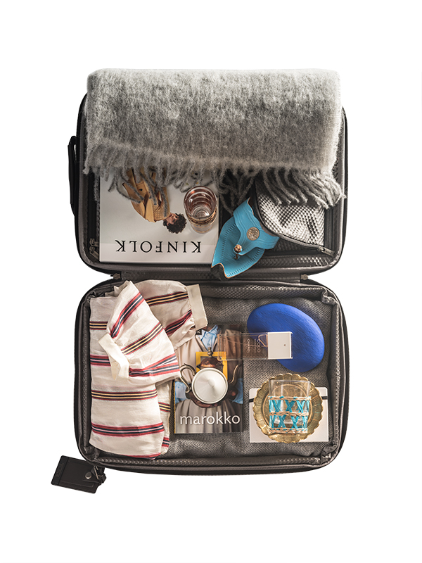 Koffer TUMI Carry-on, vanaf € 655. tumi.com, Shawl, € 125 via holzweiler.no, Magazine Kinfolk, € 18 via athenaeum.nl, Marokkaanse theeglazen,