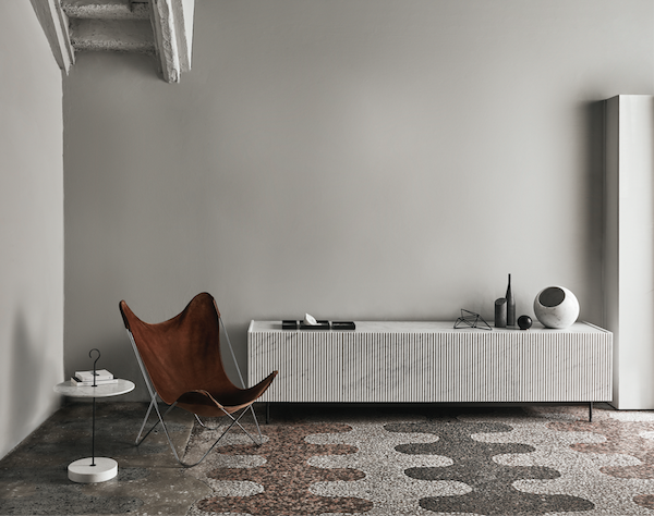 Niet veel later kwam er opnieuw, in hetzelfde pand, een appartement vrij dat Gabriele besloot te huren als pied à terre. 'Ik ben gemiddeld twee dagen per week in Milaan, en vind het prettig om dicht bij mijn showroom te zitten zonder nog te moeten reizen.' Toen hij op een avond werd uitgenodigd voor een etentje op de bovenste verdieping werd hij bij binnenkomst getroffen door de prachtige vloeren in de gangen en kamers. 'De boogvormen in mozaïek waren identiek aan de contouren op de boulevard van Rio de Janeiro's Copacabana, toegepast door Niemeyers rechterhand, landschapsarchitect Roberto Burle Marx. Hoewel de vloeren in het appartement uit achttienhonderd stammen, waren de patronen minimalistisch en modern. Bovendien bevonden alle ramen zich op het zuiden, wat inhield dat er de hele dag een prachtig licht moest zijn. Toen ik twee jaar later hoorde dat het appartement beschikbaar was, hoefde ik nog geen twee seconden na te denken.
