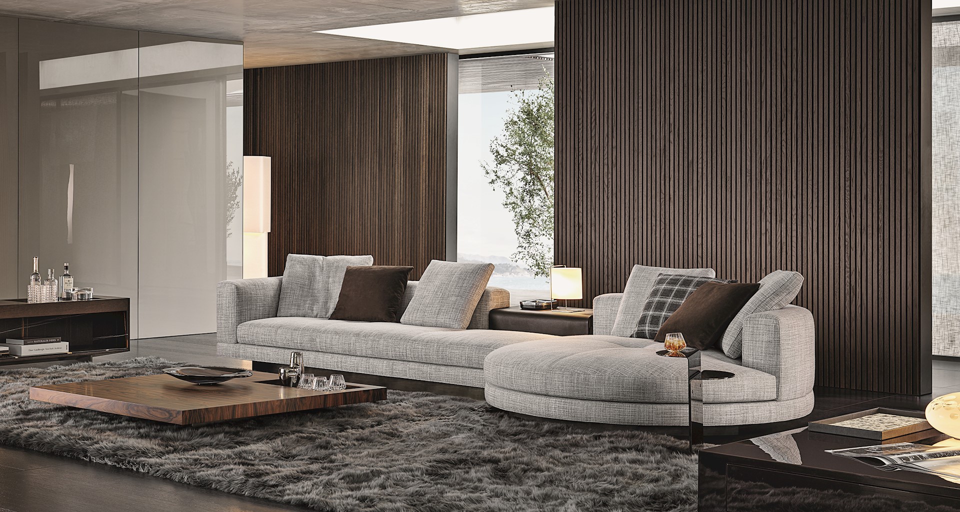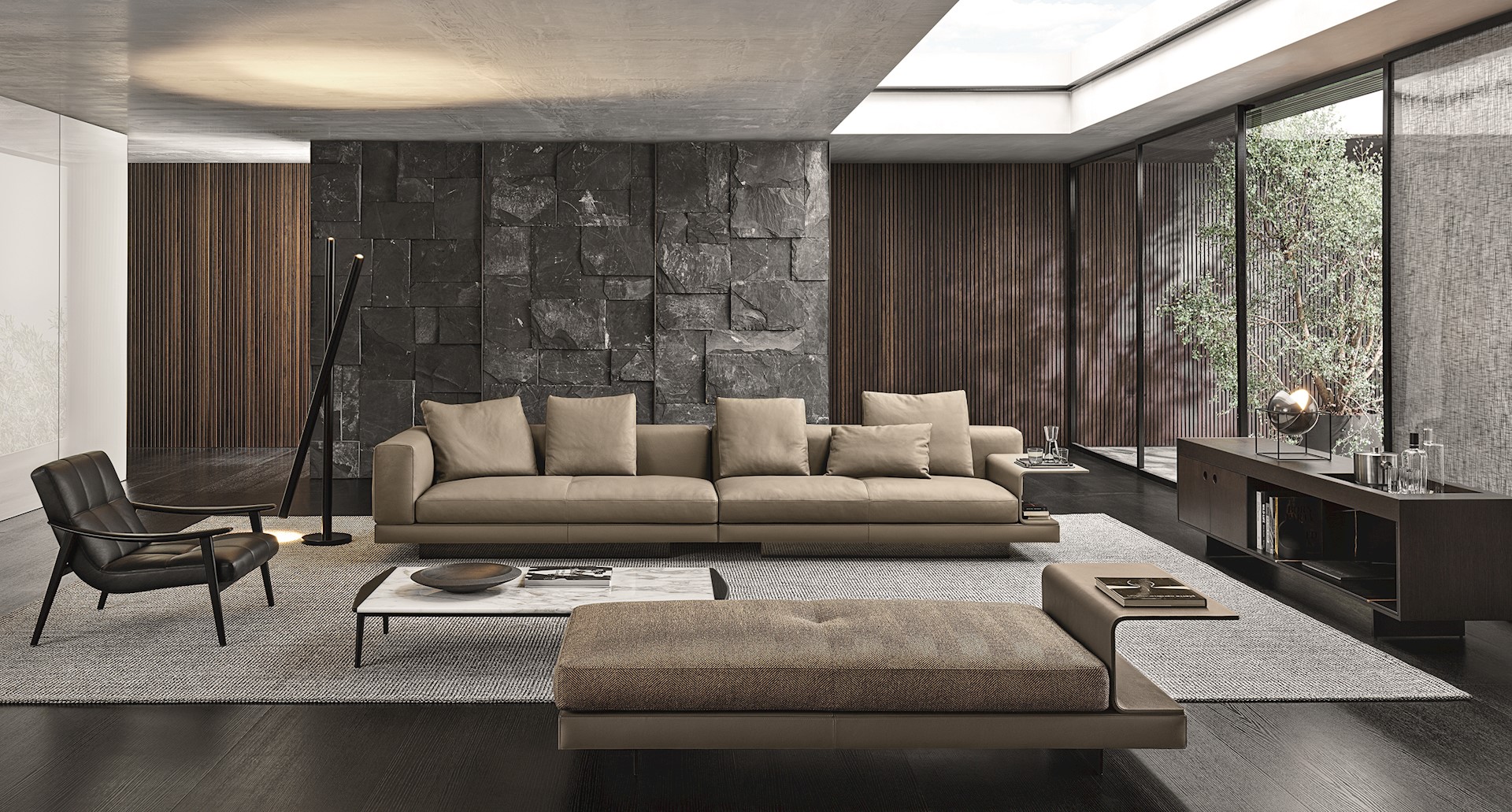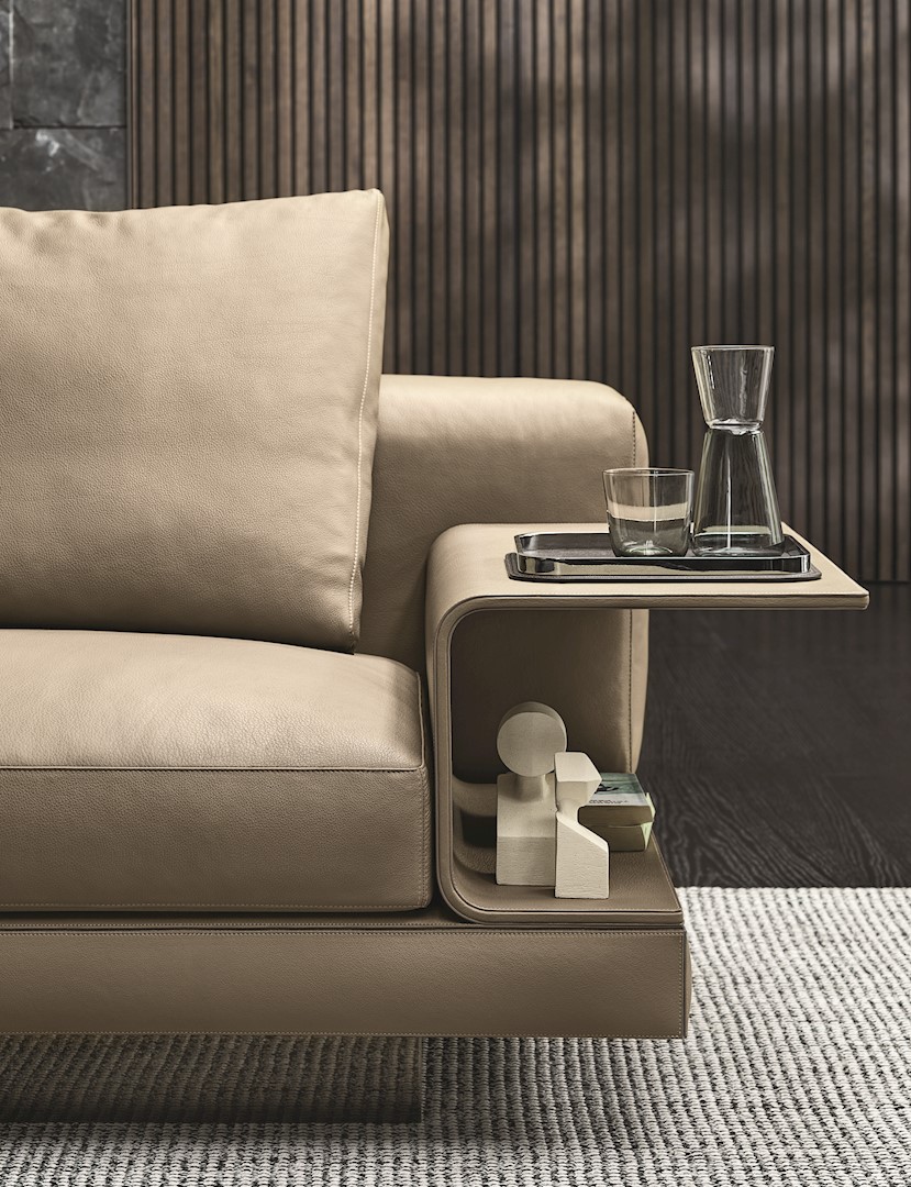 Het design van de Connery wordt bepaald door strakke lijnen en verfijnde details. De geometrische basis vormt een aangenaam contrast met de zachtheid van de zitting die is gevuld met ganzendons. De gewatteerde basis kan worden bekleed met zowel stof als met stroken leer en de ‘Flap’ planken zijn bekleed met leer of mokka-essenfineer. Daarmee krijgt deze bank met zijn architectonische design, een vleugje couture. minotti.com