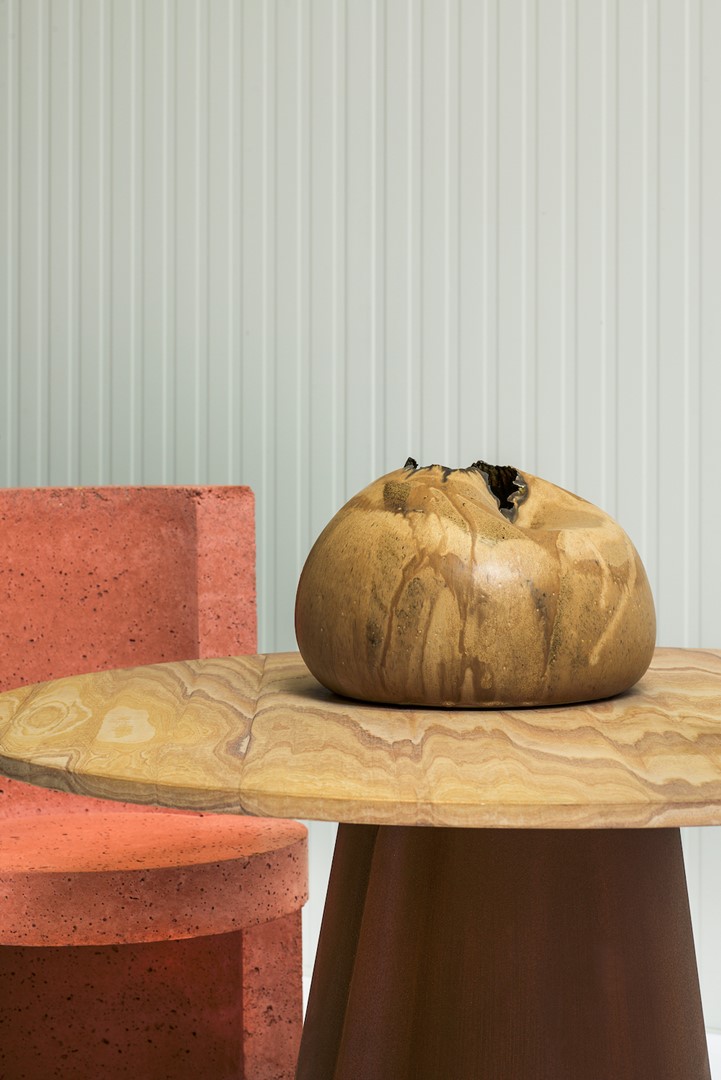 'Hier zie je de heavy chair van Studio Speciaal 2020. Verder zie je een bijzondere keramieken vintage vaas met grillige rand waarvan de designer onbekend is.