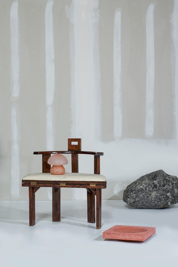 De lamp op de stoel is een vintage roze lamp door Monica Bankstrom voor Kosta Boda (uit ca. 1980). De schaal op de foto heet Concave, door Studio Speciaal 2020.'