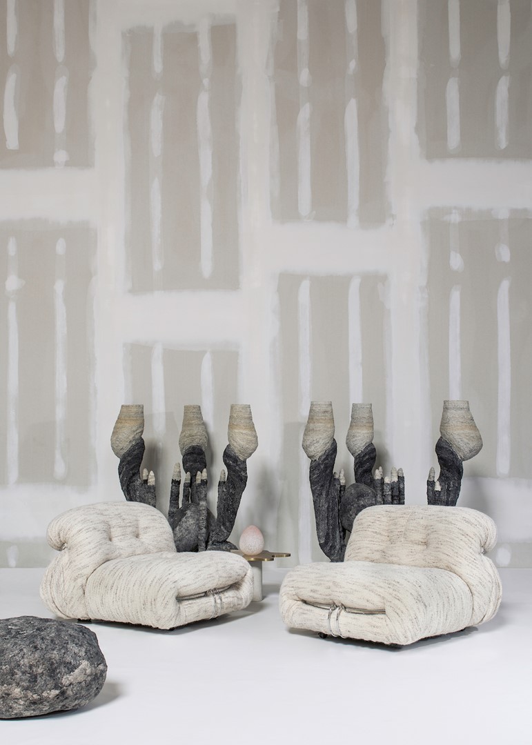 Aan de linkerkant zie je Boulders, een sculptuur door Frits Achten uit 2020 en in het midden de Soriana Lounge Chairs door Afra en Tobia Scarpa voor Cassina uit de 70's.'