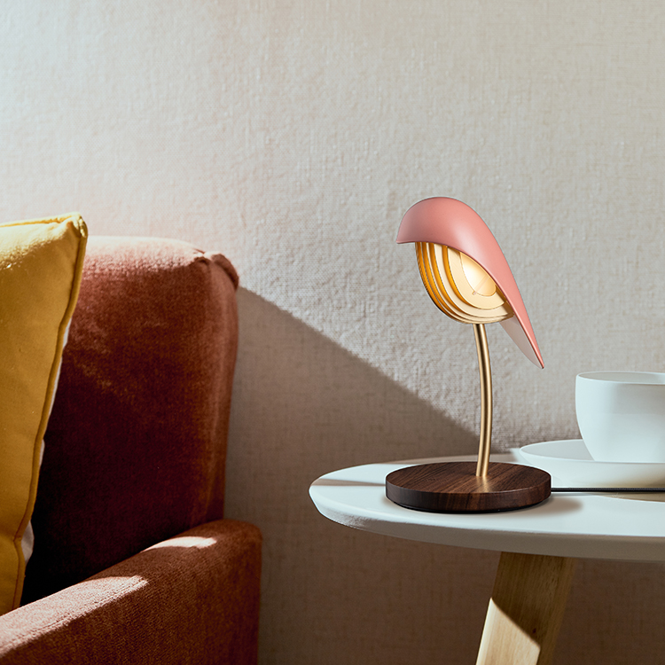 Een lamp die de donkere dagen lichter maakt, met zijn unieke gebogen vorm en organisch ontwerp. Daarnaast heeft Daqi Concept een vogelkooi in de collectie JinGoo die sfeerverlichting verenigt met een Bleutooth speaker tot een uniek object. Deze met kersenbloesem print staat symbool voor vernieuwing en hoop, vanaf €129. Daqiconcept.com