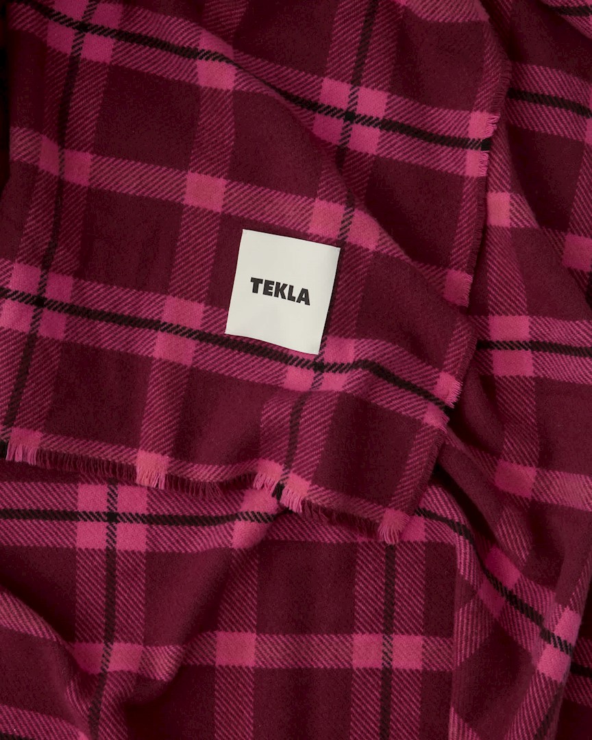 Warme deken van Tekla van zacht merino wol in een vrolijke roze check motief. Voor gezellige momenten in bed of op de bank! €375. Teklafabrics.com