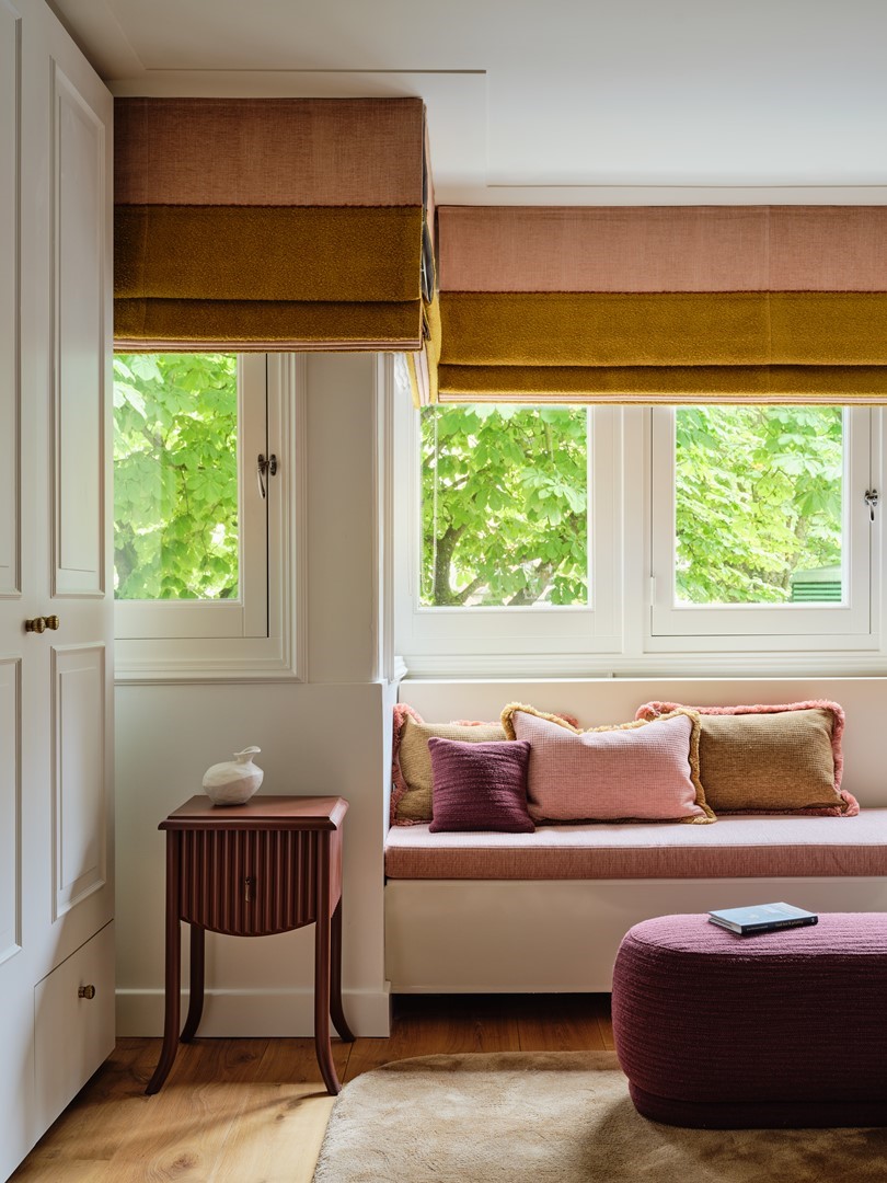 Haar hoofd is een soort lopend fotoarchief. ‘Ik denk in kleuren en beelden in plaats van in woorden. En ik onthoud alles wat ik zie.’ Haar werkwijze noemt ze gekscherend een ‘chaotisch proces’. ‘Ik heb alle stoffen en merken in mijn ladekasten, ik heb wel duizenden stalen. Dan begin ik met kijken waar ik me tot aangetrokken voel, in combinatie met het huis en de bewoners. Het is een soort langzame wandeling door alles wat ik weet en wat ik om me heen zie.’