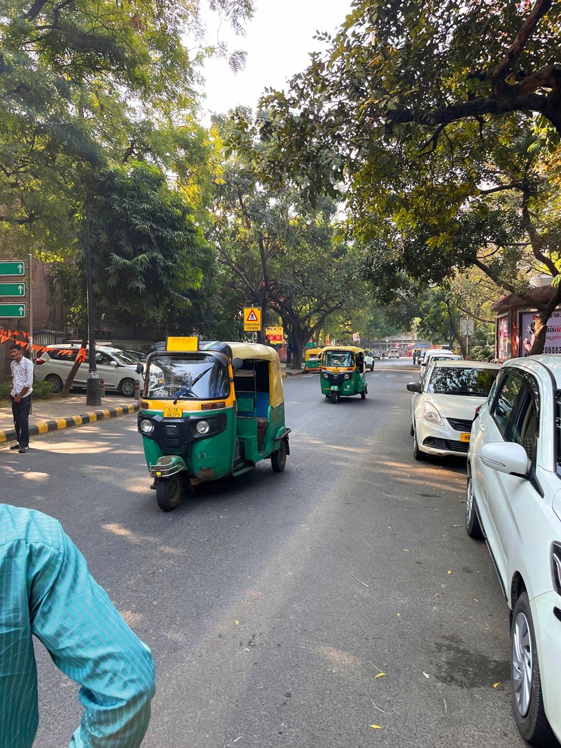 Het verkeer bestaat voor het grootste deel uit wat in Nederland de tuktuk heet (hier noemt men ze een auto rickshaw), driewielige taxi’s waar in theorie drie mensen in passen. Je ziet ze regelmatig rijden met twaalf mensen erin, erop en erachter. Verder zijn er allerlei kleine vrachtwagentjes van onbekend fabricaat, met daartussen koeien.
