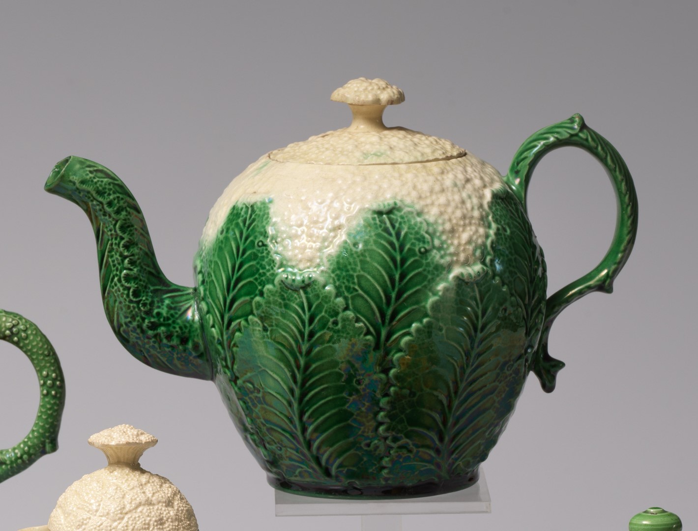 Opvallend zijn de zogenoemde trompe-l’oeil objecten: theeserviezen die zich voordoen als groente, fruit of schelpen. De keramische bloemkool is daar een sprekend voorbeeld van. Het zijn objecten die spelen met verwachting en illusie. Dit soort stukken laat zien dat humor en experiment geen moderne uitvinding zijn. De achttiende eeuw kende al een fascinatie voor theatrale tafelmomenten.