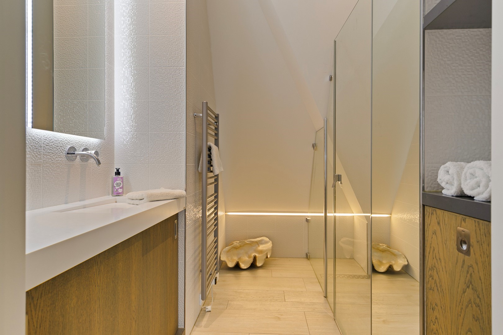 Via de lift maar ook via het trappenhuis is de dubbele garage aan de achterzijde bereikbaar. Deze twee garages zijn extern toegankelijk via twee elektrisch bedienbare garagedeuren. In deze ruimte bevindt zich een extra blok met wastafel en inbouwkasten. Tenslotte is er nog een ruimte voor een wasmachine en droger en een extra douche: komt u vanaf het strand, dan kunt u eerst lekker douchen en daarna ontspannen op uw eigen rooftop terras. Dat geeft toch een heerlijk gevoel.