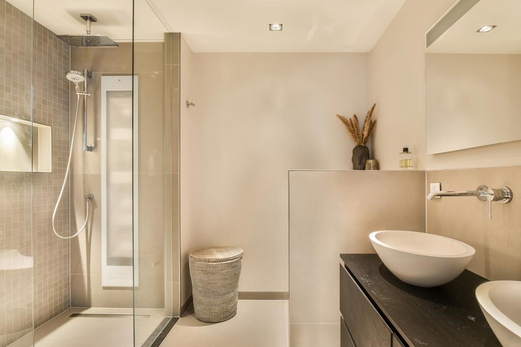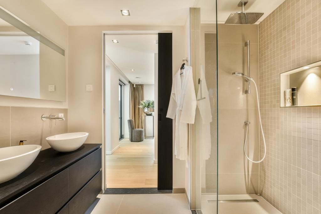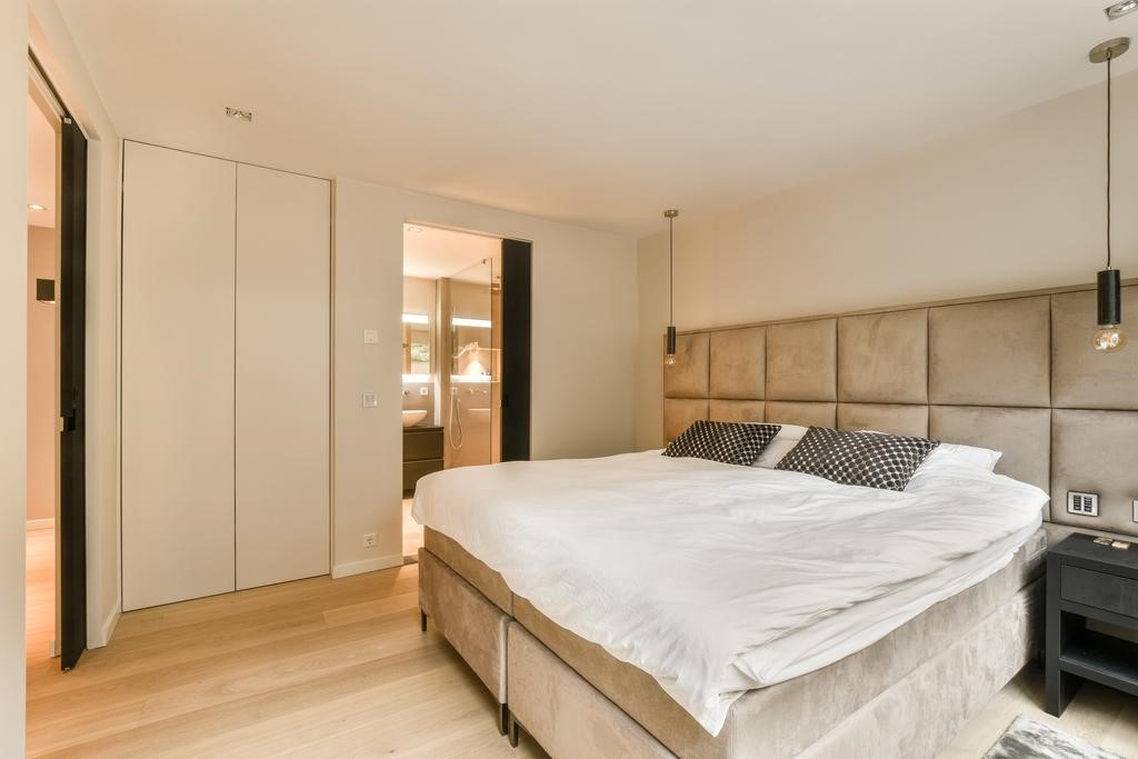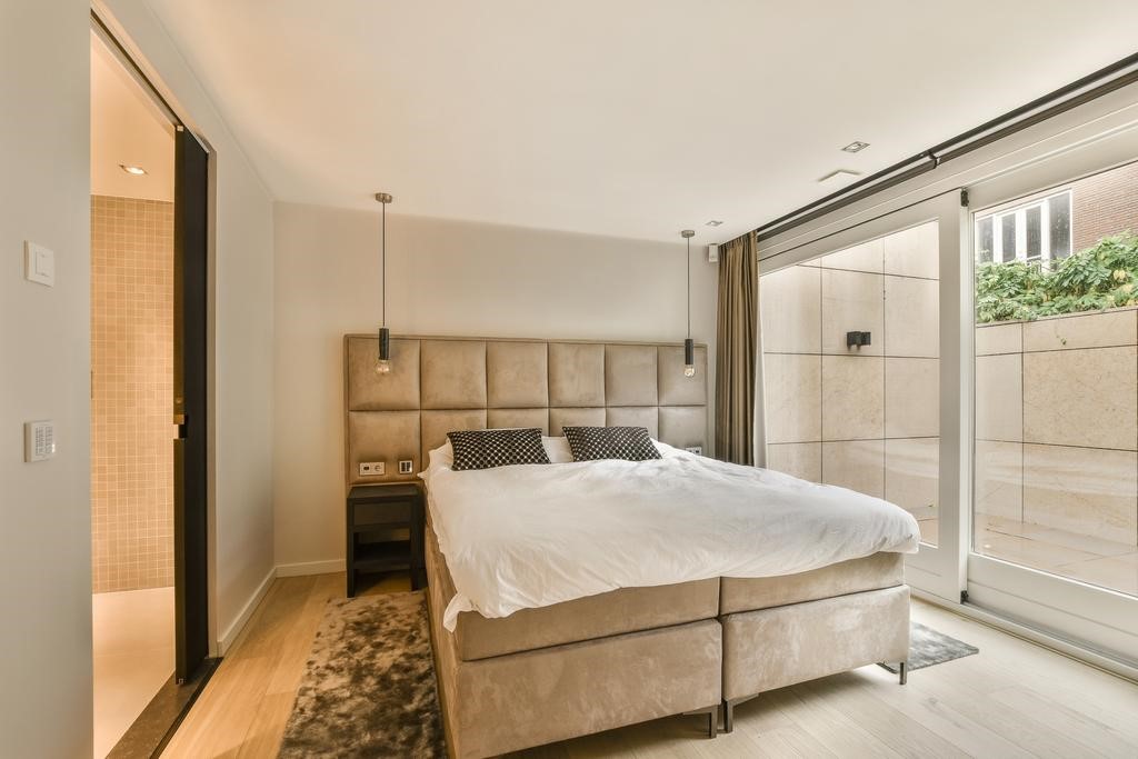 The master bedroom features a spacious walk-in closet and two French doors to the garden. The bathroom is luxuriously equipped with a wide walk-in shower with a double rain shower, a wide washbasin with mirror wall and lighting and a toilet.
