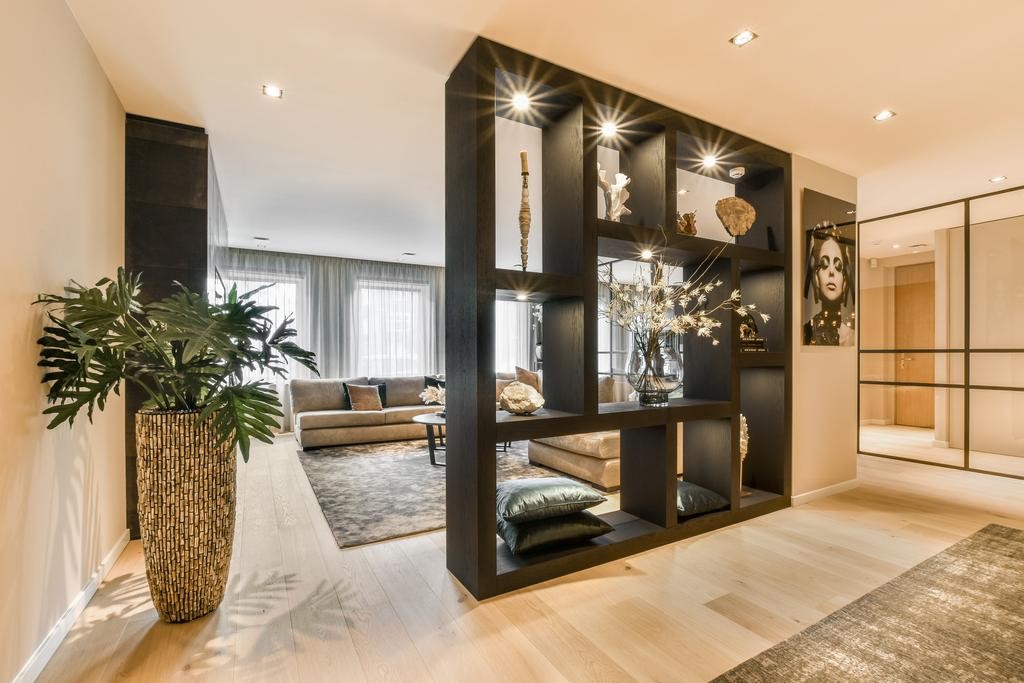 Gemeenschappelijke entree van waaruit de royale hal toegang biedt tot het appartement. Deze hal, voorzien van dubbele inbouwkast en glas in stalen wand, biedt toegang tot de ruime living met open keuken. De living is onderverdeeld in een zit– en eetgedeelte, gescheiden middels een fraaie open boekenwand. De zitkamer beschikt over een brede gashaard. Er is een royale werkkamer gecreëerd aan de voorzijde. Deze is toegankelijk vanuit de hal en kan ook als derde slaapkamer gebruikt worden.