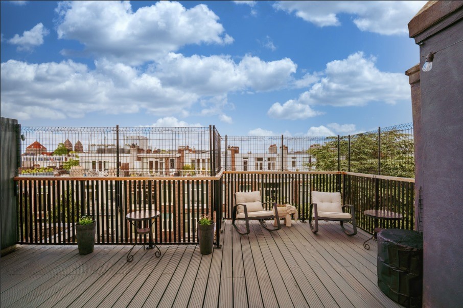 At the front, you’ll find the bright and generous living room, which flows seamlessly into the open dining kitchen. The large kitchen island, modern built-in appliances, and thoughtful layout make this space ideal for cooking, dining, and spending quality time together. From the living room, double doors open onto a charming French balcony, perfect for enjoying a morning coffee in the sun.