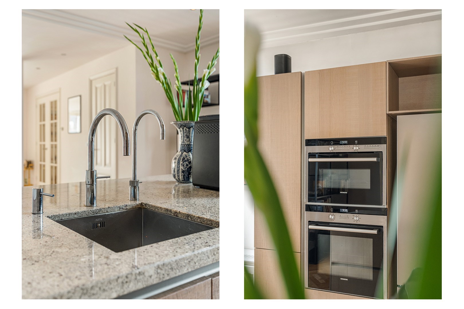 Aan de voorzijde bevindt zich de lichte en royale living, die naadloos overgaat in de open eetkeuken. Het grote kookeiland, de moderne inbouwapparatuur en de doordachte indeling maken deze ruimte ideaal om te koken, te tafelen en gezellig samen te zijn. Vanuit de woonkamer openen dubbele deuren naar een charmant Frans balkon, perfect voor een ochtendkoffie in het zonnetje.