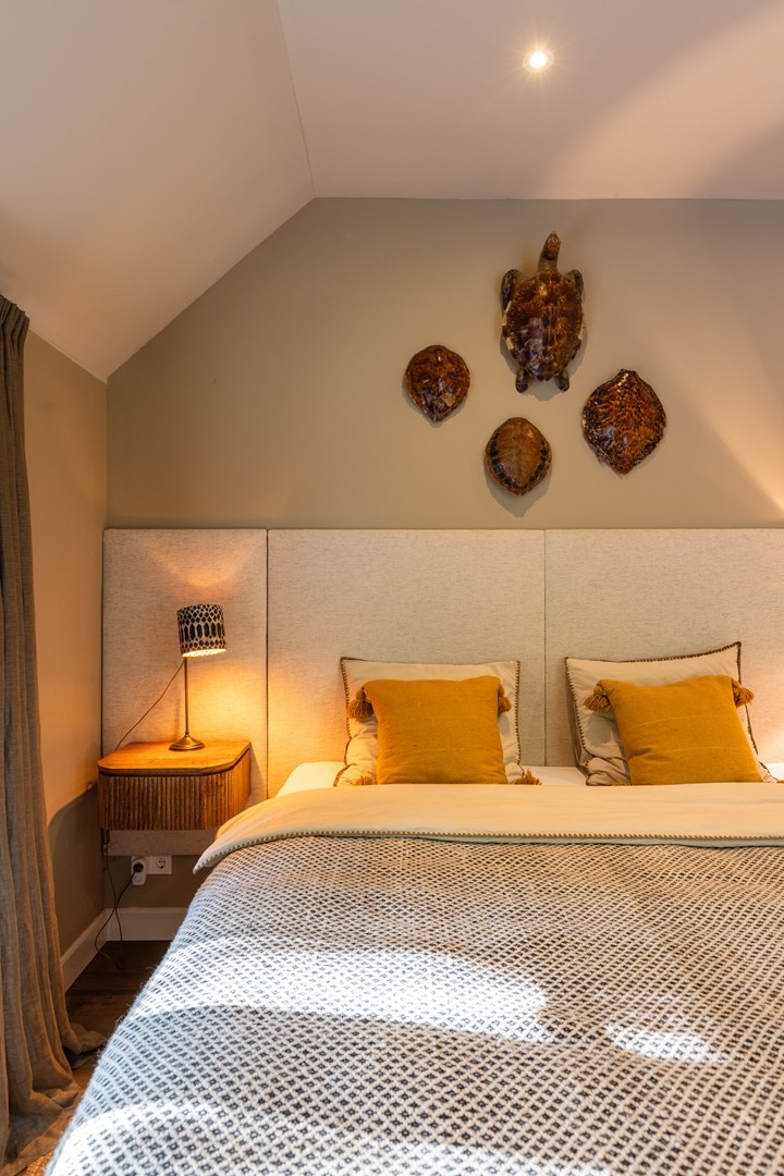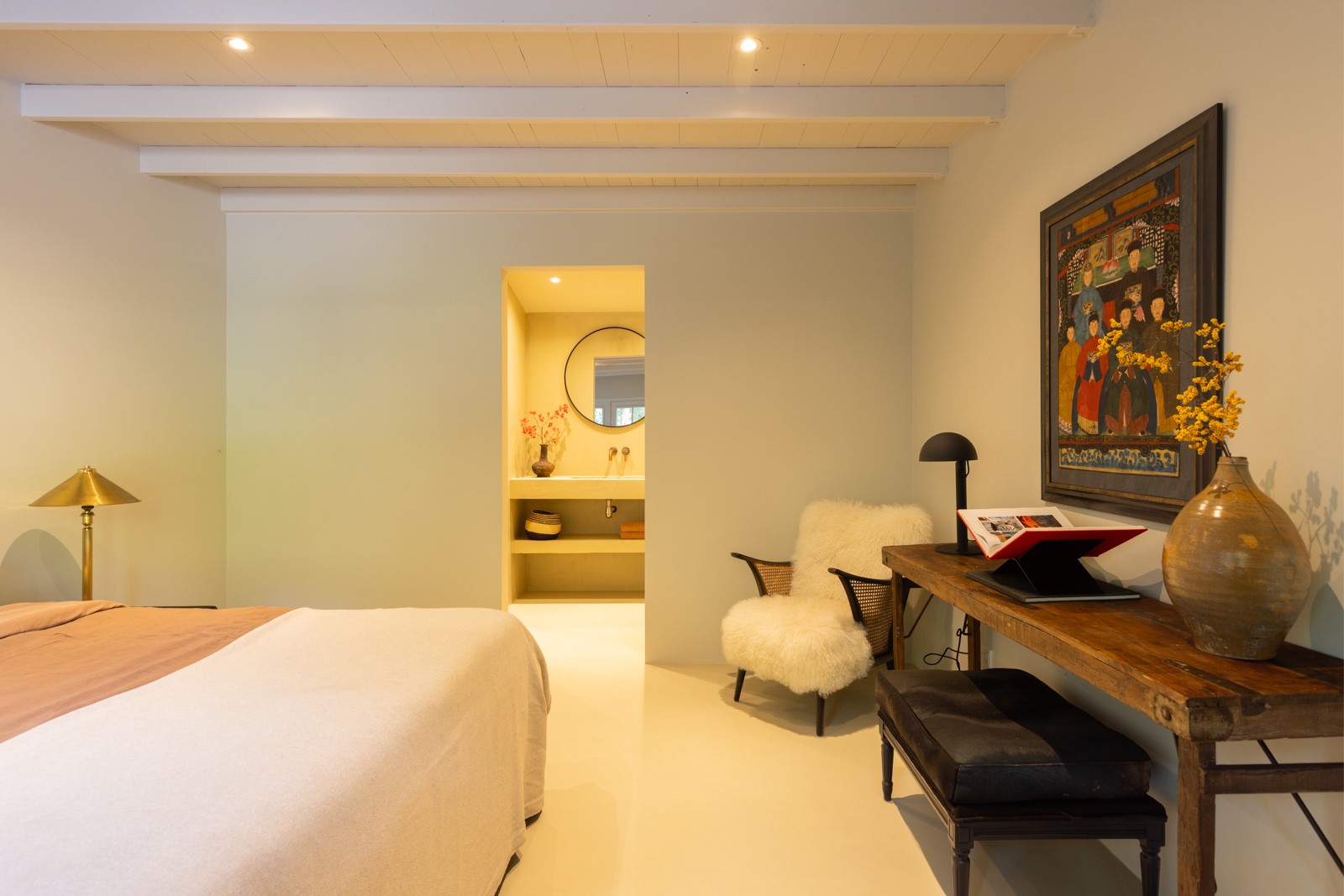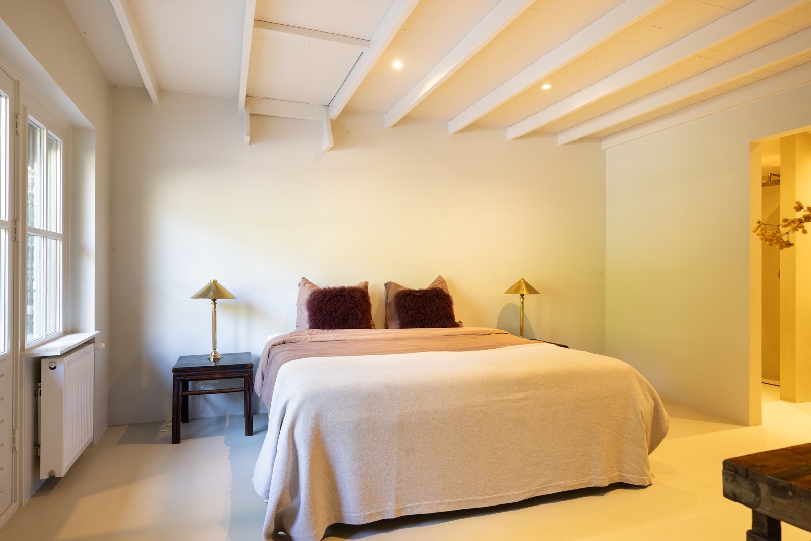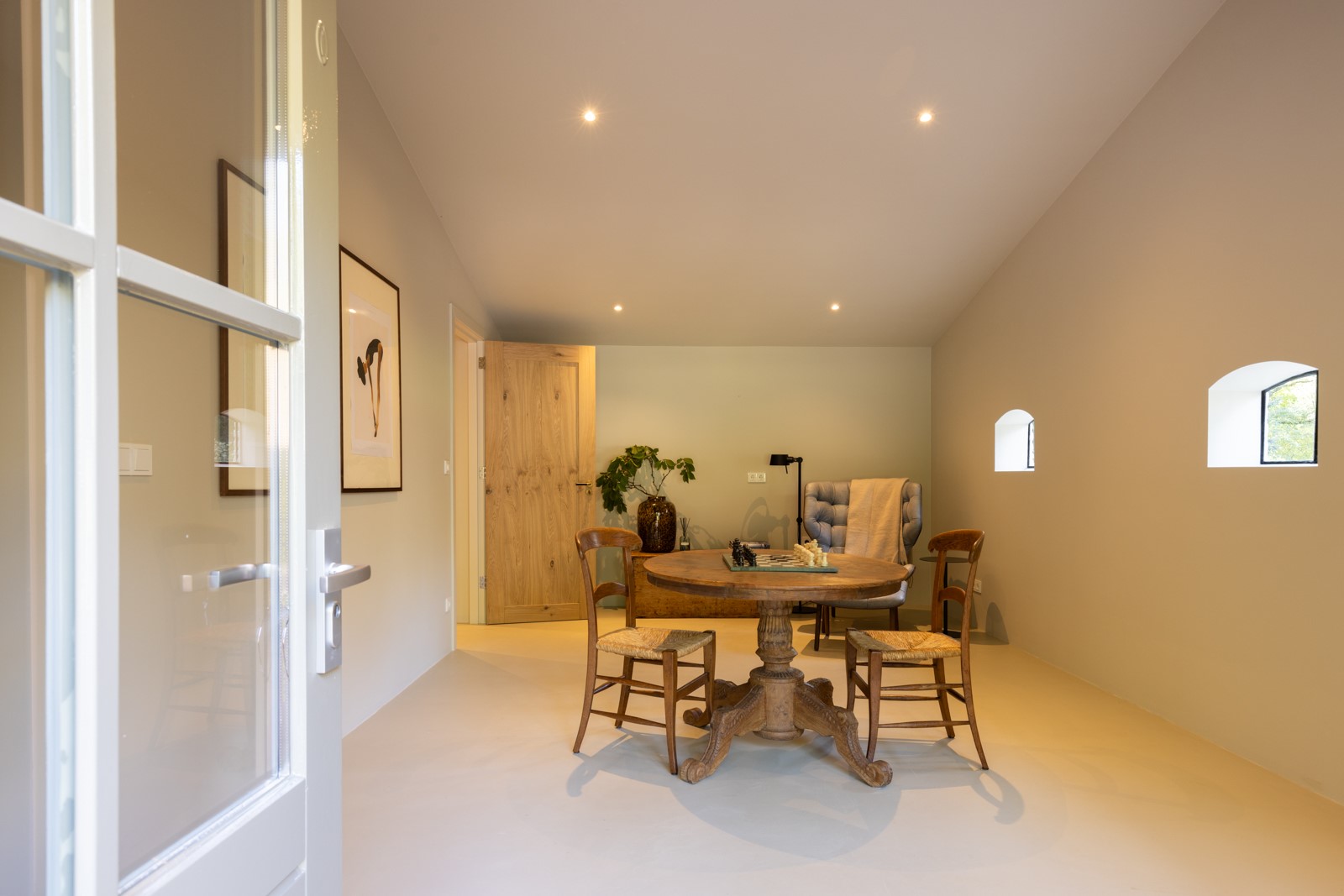 Voorbij de houtopslag staat het nog maar net opgeleverde guesthouse. Een one of a kind qua zowel ligging als esthetiek. De wanden in Little Green – Portland Stone, gaan haast naadloos over in de gietvloer en Mortex in de badkamer. Alles in dezelfde kleurstelling. Hoe zen wilt u het hebben? Misschien heeft u al een bestemming in gedachten? Een praktijk aan huis of een atelier bijvoorbeeld. Er is veel mogelijk. Denkt u aan een B&B? Een bezettingsgraad van 80% is in deze omgeving niet ongebruikelijk.