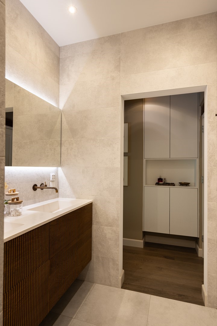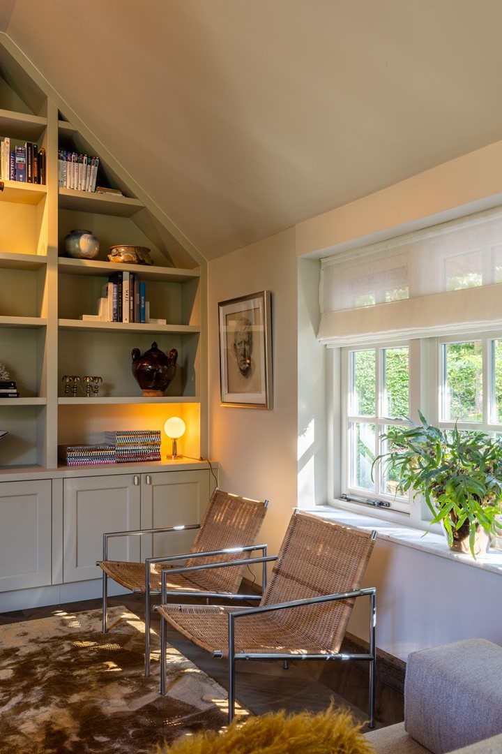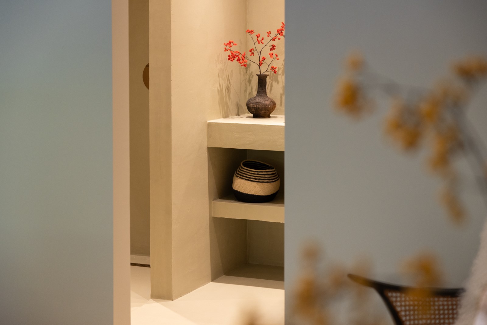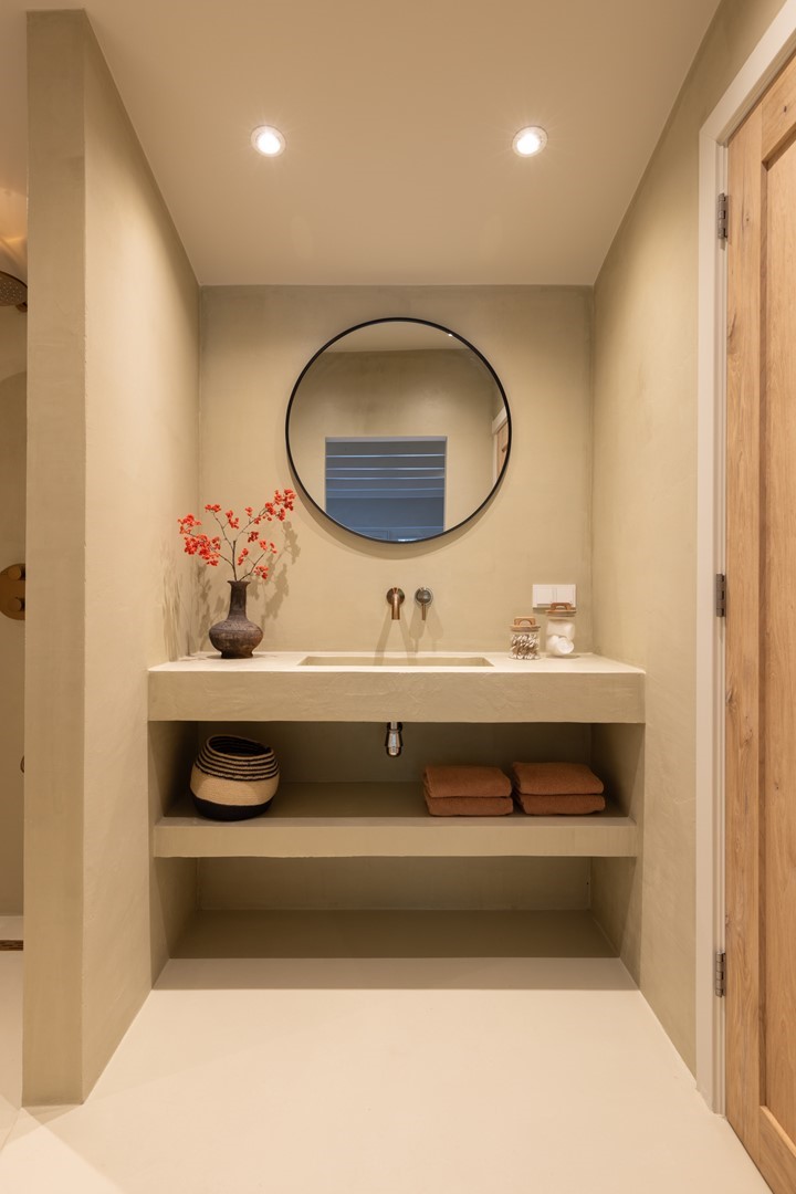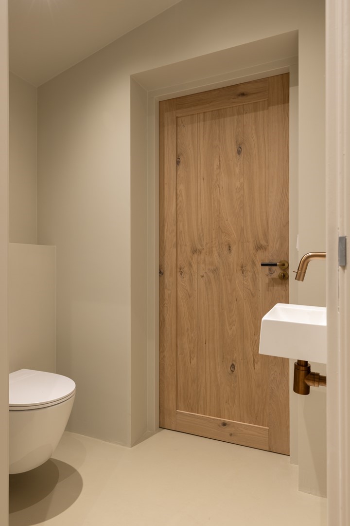 Voorbij de houtopslag staat het nog maar net opgeleverde guesthouse. Een one of a kind qua zowel ligging als esthetiek. De wanden in Little Green – Portland Stone, gaan haast naadloos over in de gietvloer en Mortex in de badkamer. Alles in dezelfde kleurstelling. Hoe zen wilt u het hebben? Misschien heeft u al een bestemming in gedachten? Een praktijk aan huis of een atelier bijvoorbeeld. Er is veel mogelijk. Denkt u aan een B&B? Een bezettingsgraad van 80% is in deze omgeving niet ongebruikelijk.