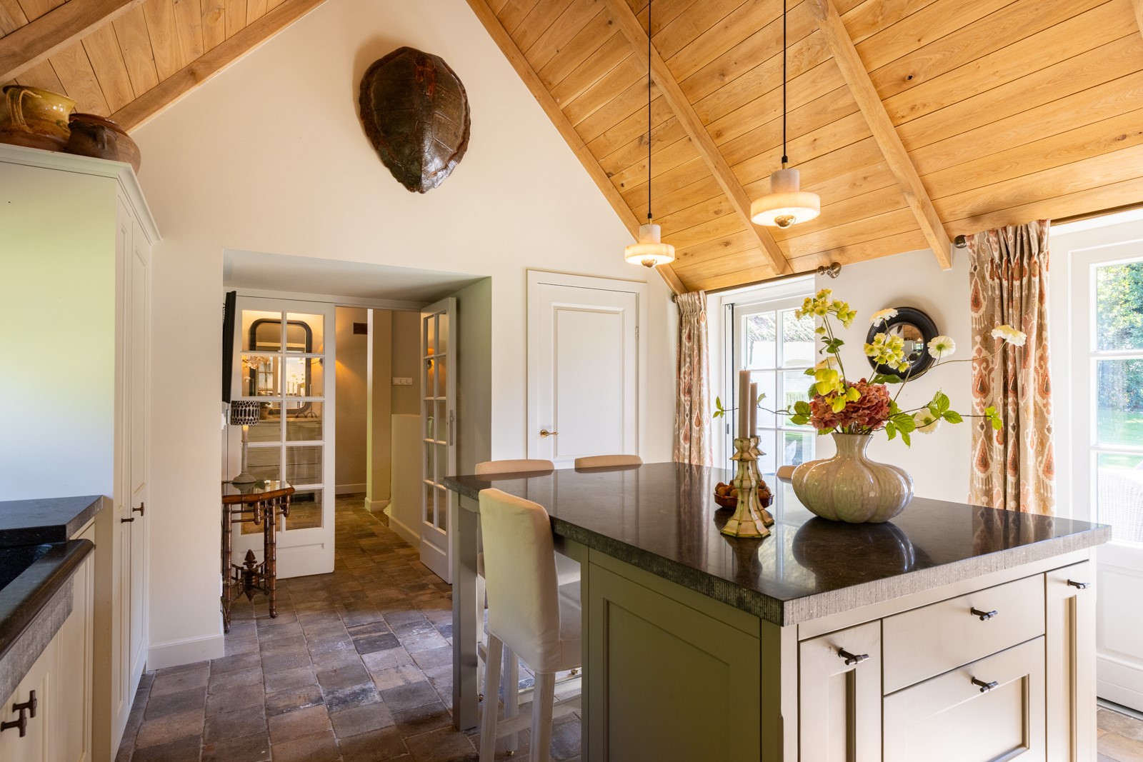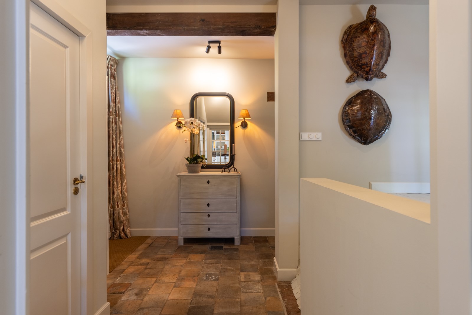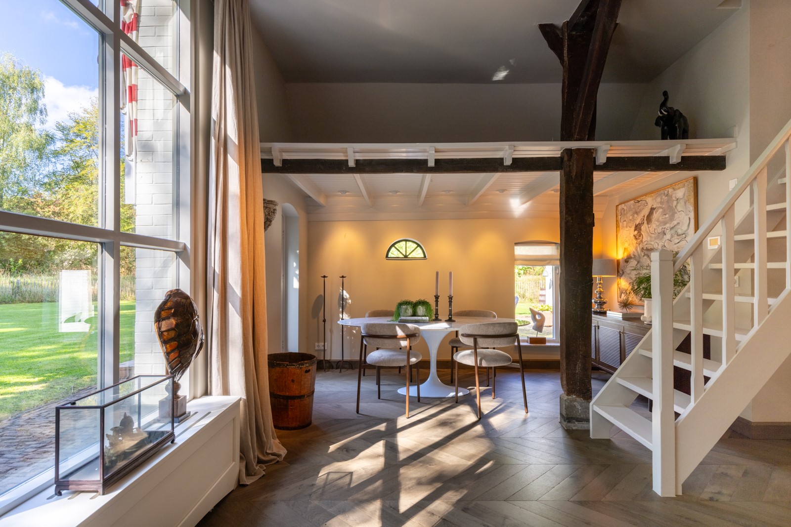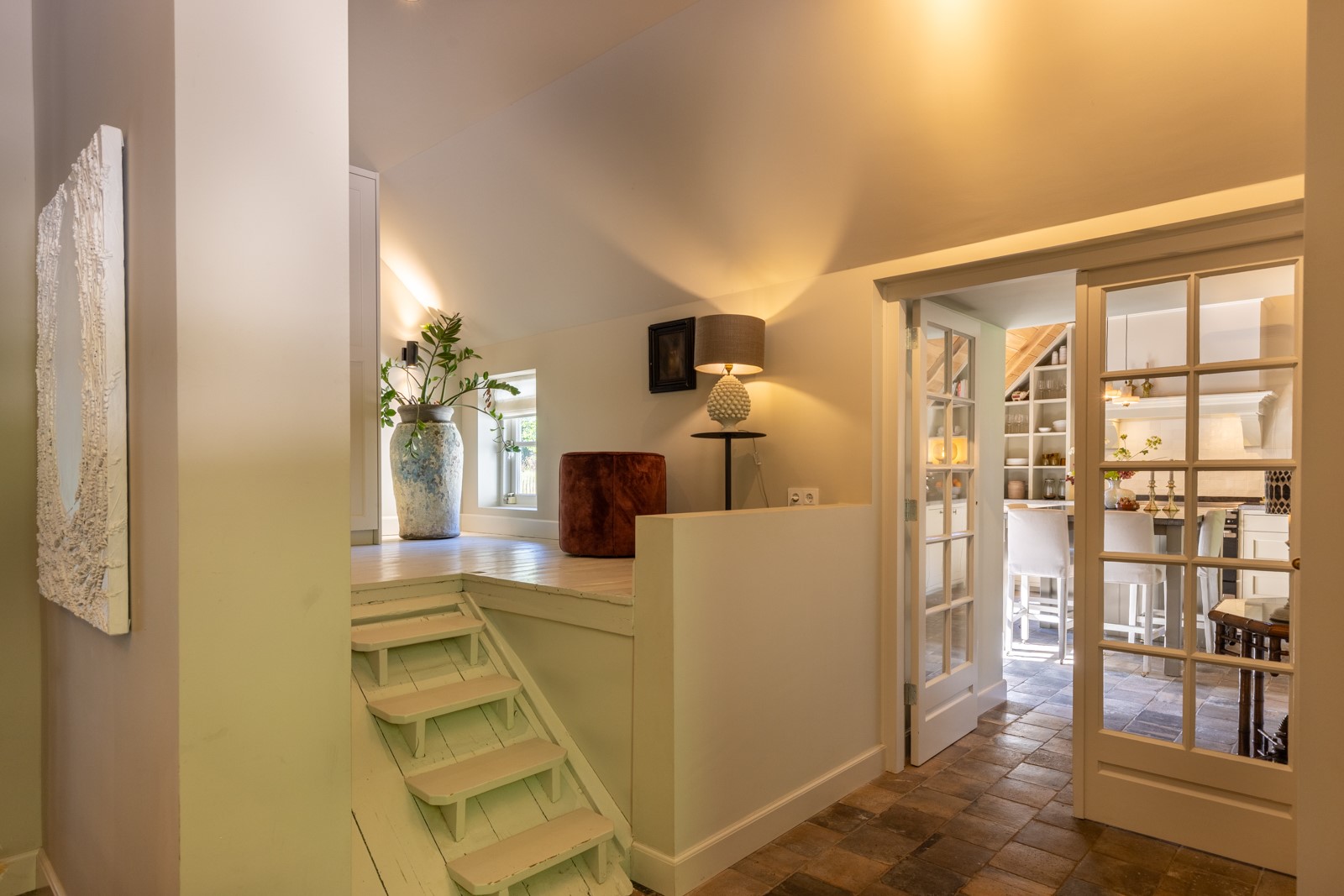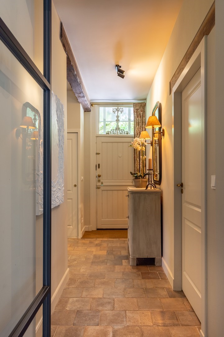 U parkeert achter het witte hek op het grind. De entree ligt in de schaduw van een grote magnolia. Binnen springt de stijlvol gerestaureerde opkamer direct in het oog. De aangrenzende maatwerkkeuken met Falconfornuis (inductie) is haast professioneel uitgerust. In de woonkamer contrasteren strak gestucte wanden met de ‘nostalgische’, nieuw gemaakte balken en hildes. Stalen deuren zorgen voor ruimtelijkheid. De HR Barbas houtkachel zorgt voor warmte in de winter; in de zomer biedt – net als vroeger - de leilinde schaduw. U ziet en voelt dat alles in en om dit thuis tot in detail is doordacht en met alleen de allerbeste materialen werd uitgevoerd.