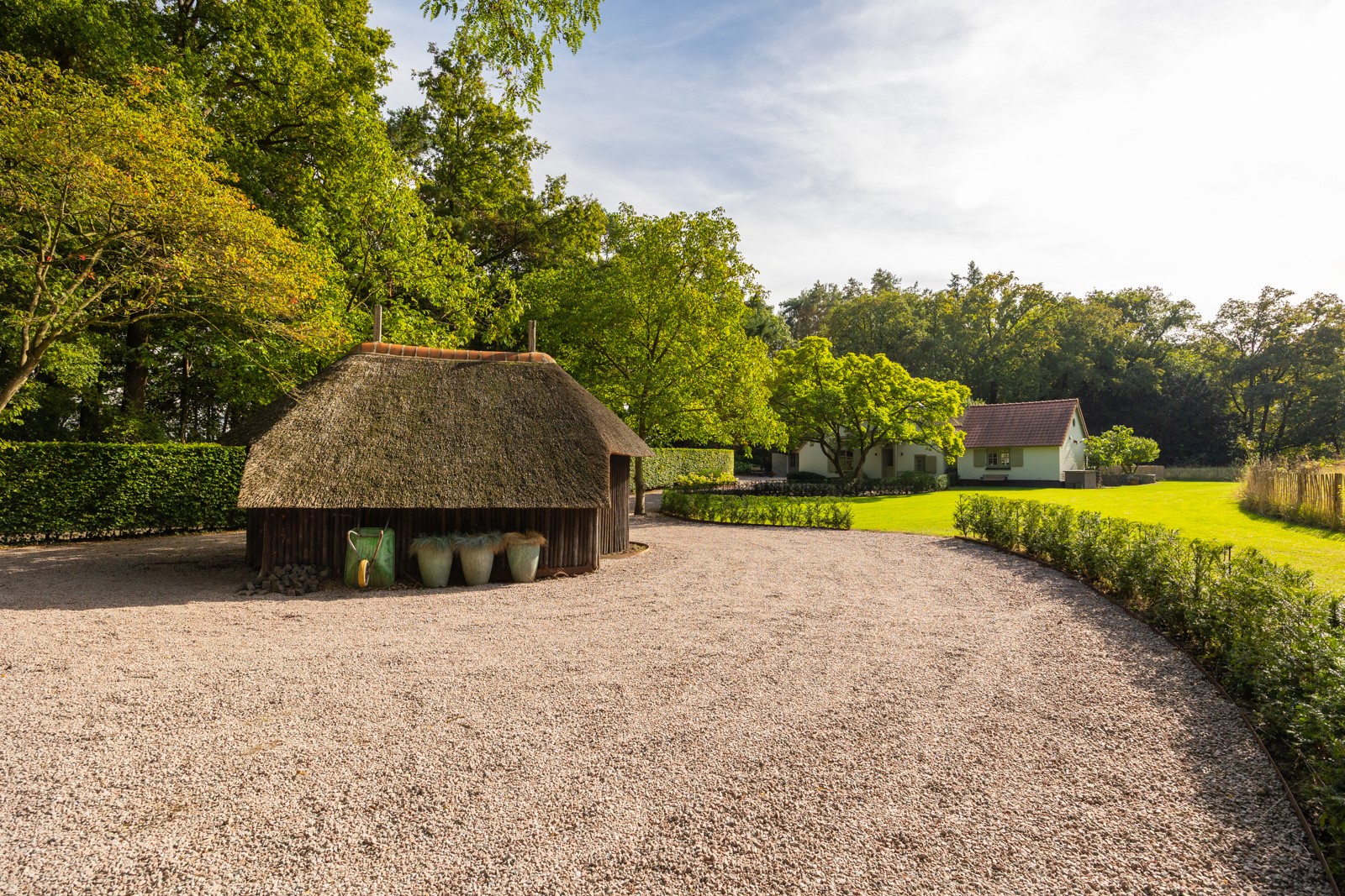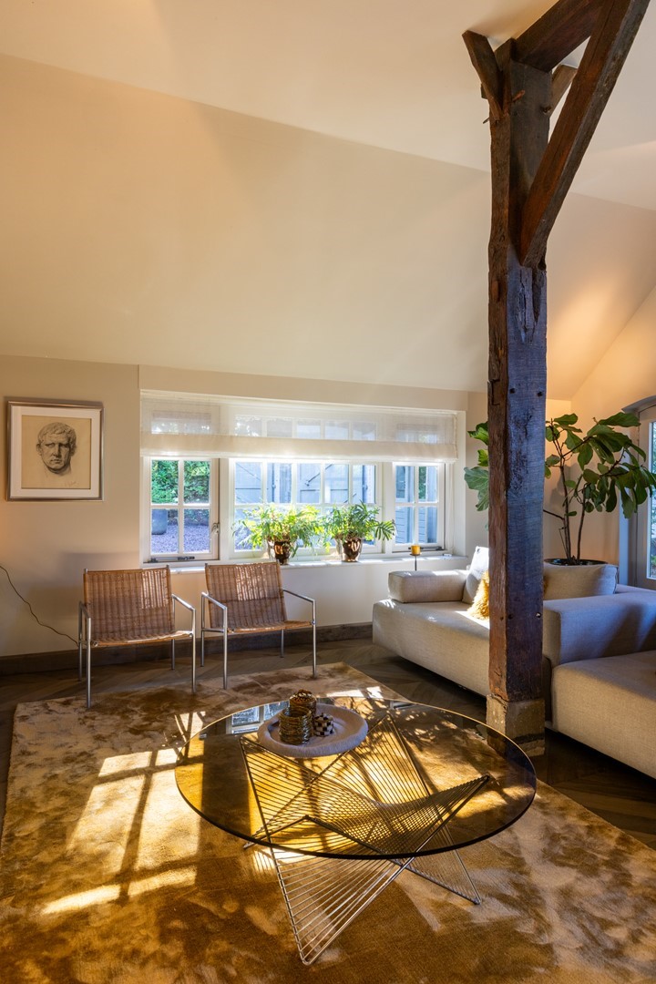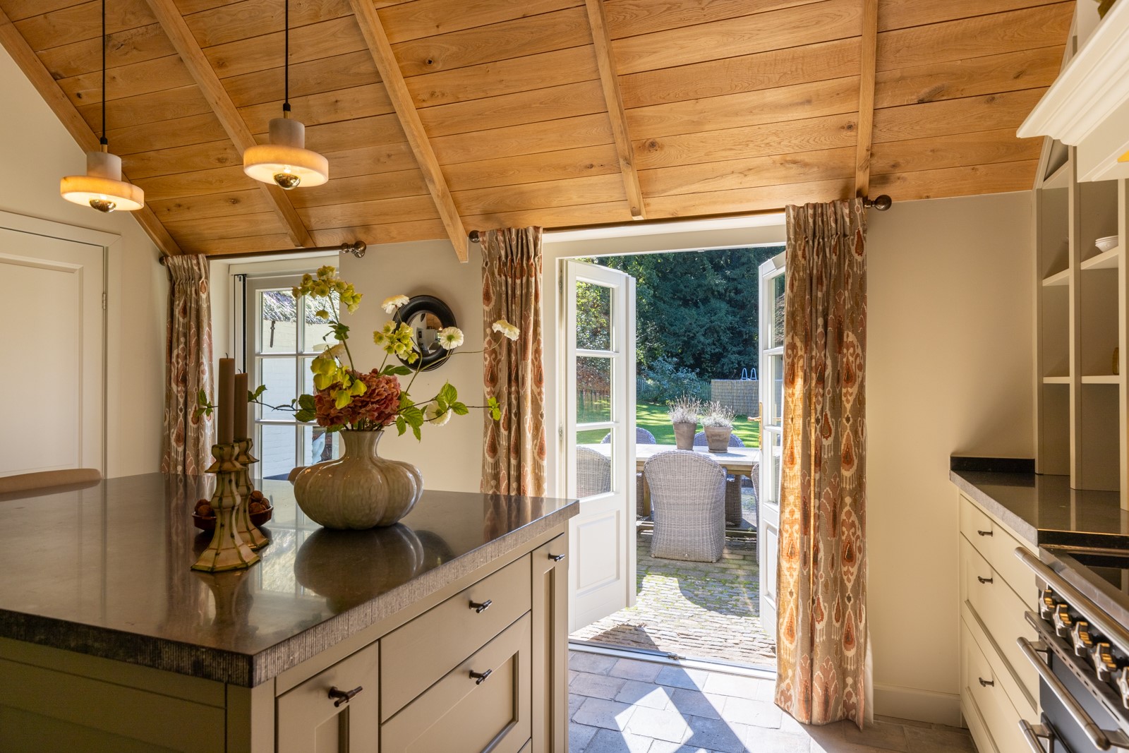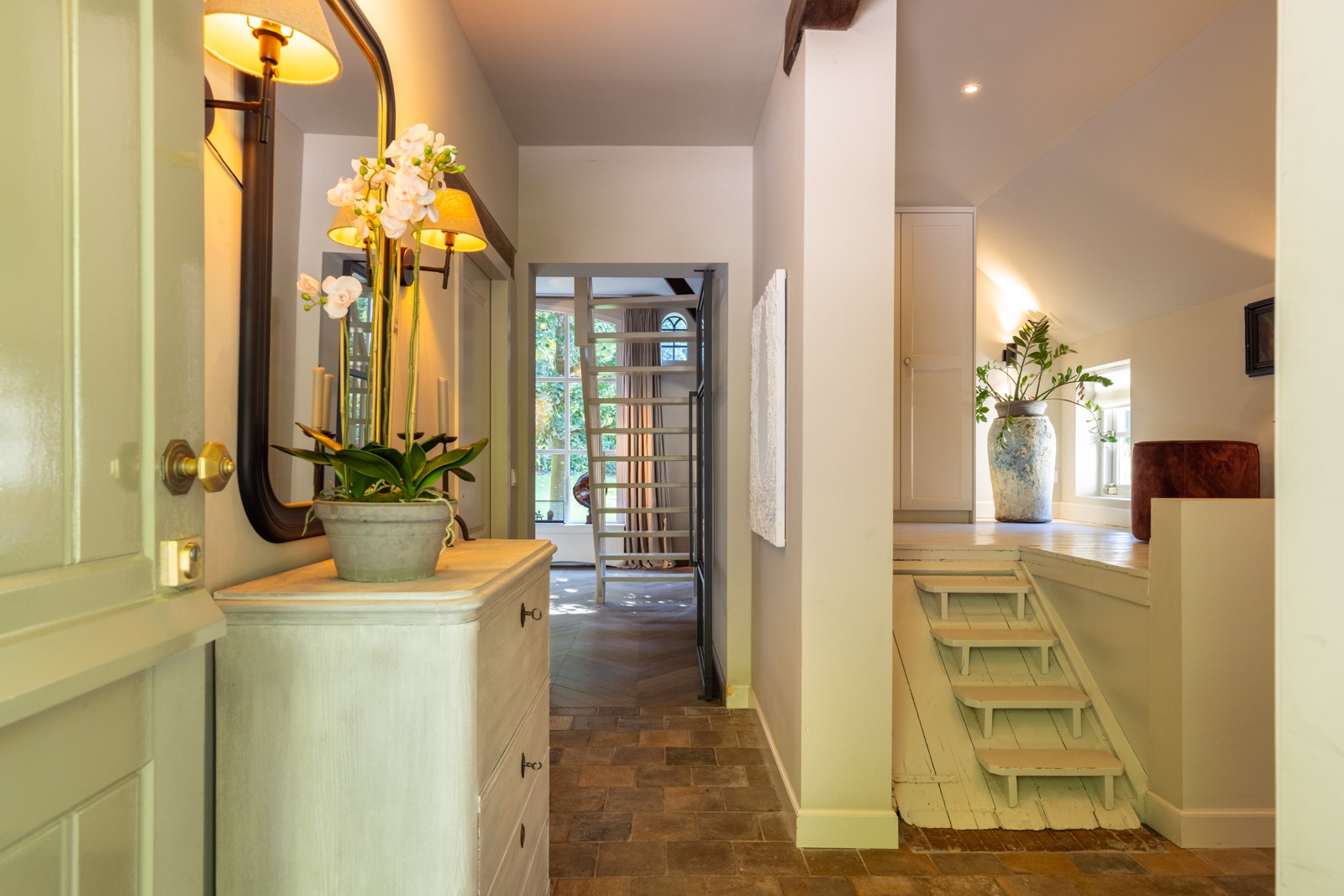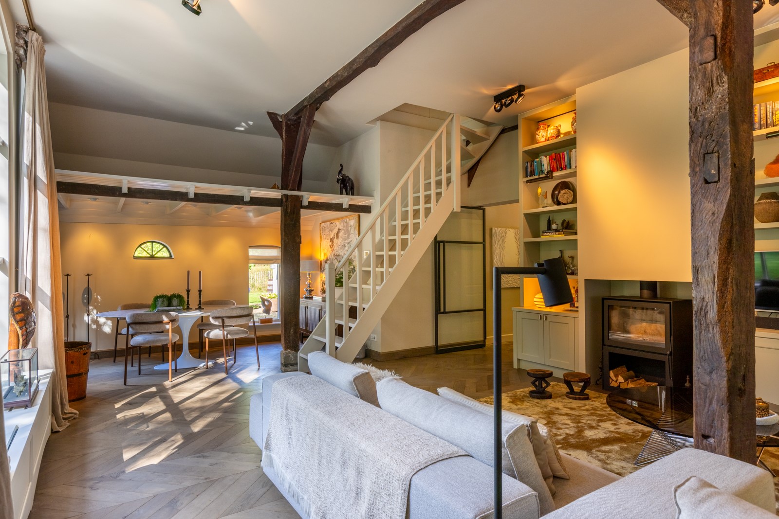 U parkeert achter het witte hek op het grind. De entree ligt in de schaduw van een grote magnolia. Binnen springt de stijlvol gerestaureerde opkamer direct in het oog. De aangrenzende maatwerkkeuken met Falconfornuis (inductie) is haast professioneel uitgerust. In de woonkamer contrasteren strak gestucte wanden met de ‘nostalgische’, nieuw gemaakte balken en hildes. Stalen deuren zorgen voor ruimtelijkheid. De HR Barbas houtkachel zorgt voor warmte in de winter; in de zomer biedt – net als vroeger - de leilinde schaduw. U ziet en voelt dat alles in en om dit thuis tot in detail is doordacht en met alleen de allerbeste materialen werd uitgevoerd.