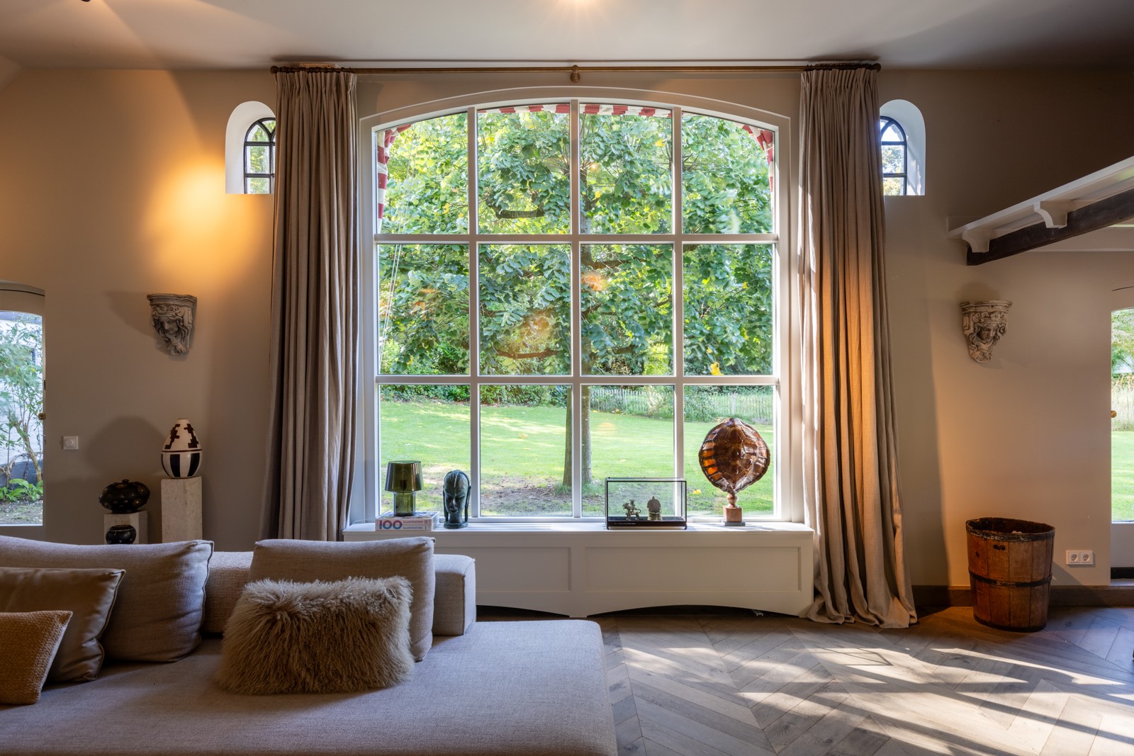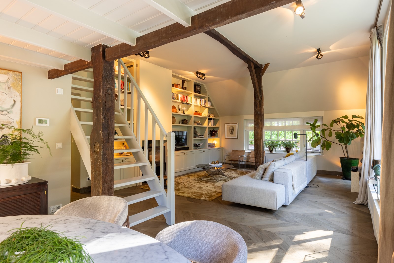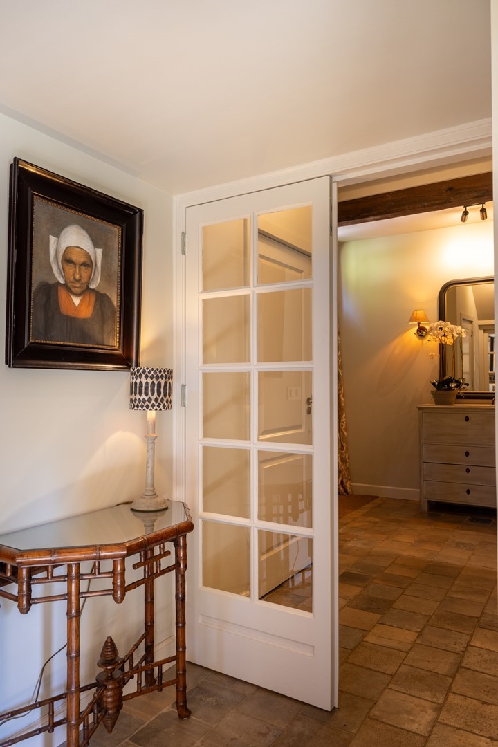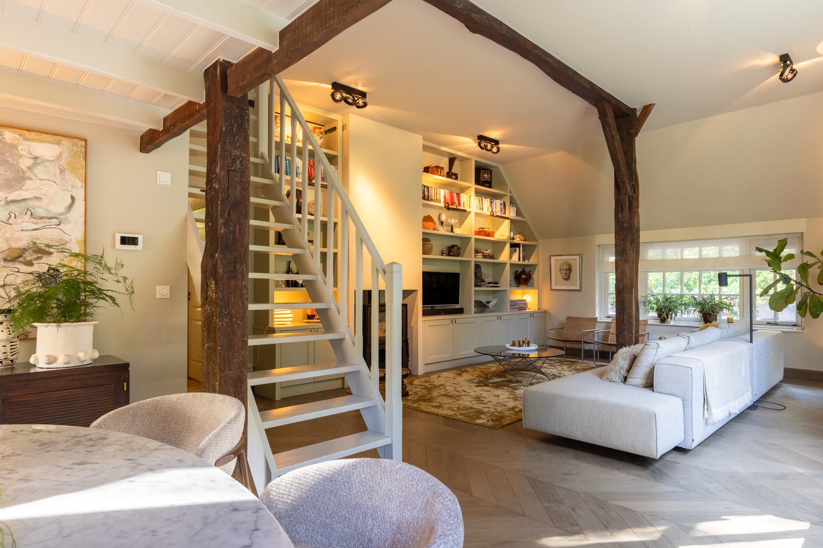 U parkeert achter het witte hek op het grind. De entree ligt in de schaduw van een grote magnolia. Binnen springt de stijlvol gerestaureerde opkamer direct in het oog. De aangrenzende maatwerkkeuken met Falconfornuis (inductie) is haast professioneel uitgerust. In de woonkamer contrasteren strak gestucte wanden met de ‘nostalgische’, nieuw gemaakte balken en hildes. Stalen deuren zorgen voor ruimtelijkheid. De HR Barbas houtkachel zorgt voor warmte in de winter; in de zomer biedt – net als vroeger - de leilinde schaduw. U ziet en voelt dat alles in en om dit thuis tot in detail is doordacht en met alleen de allerbeste materialen werd uitgevoerd.