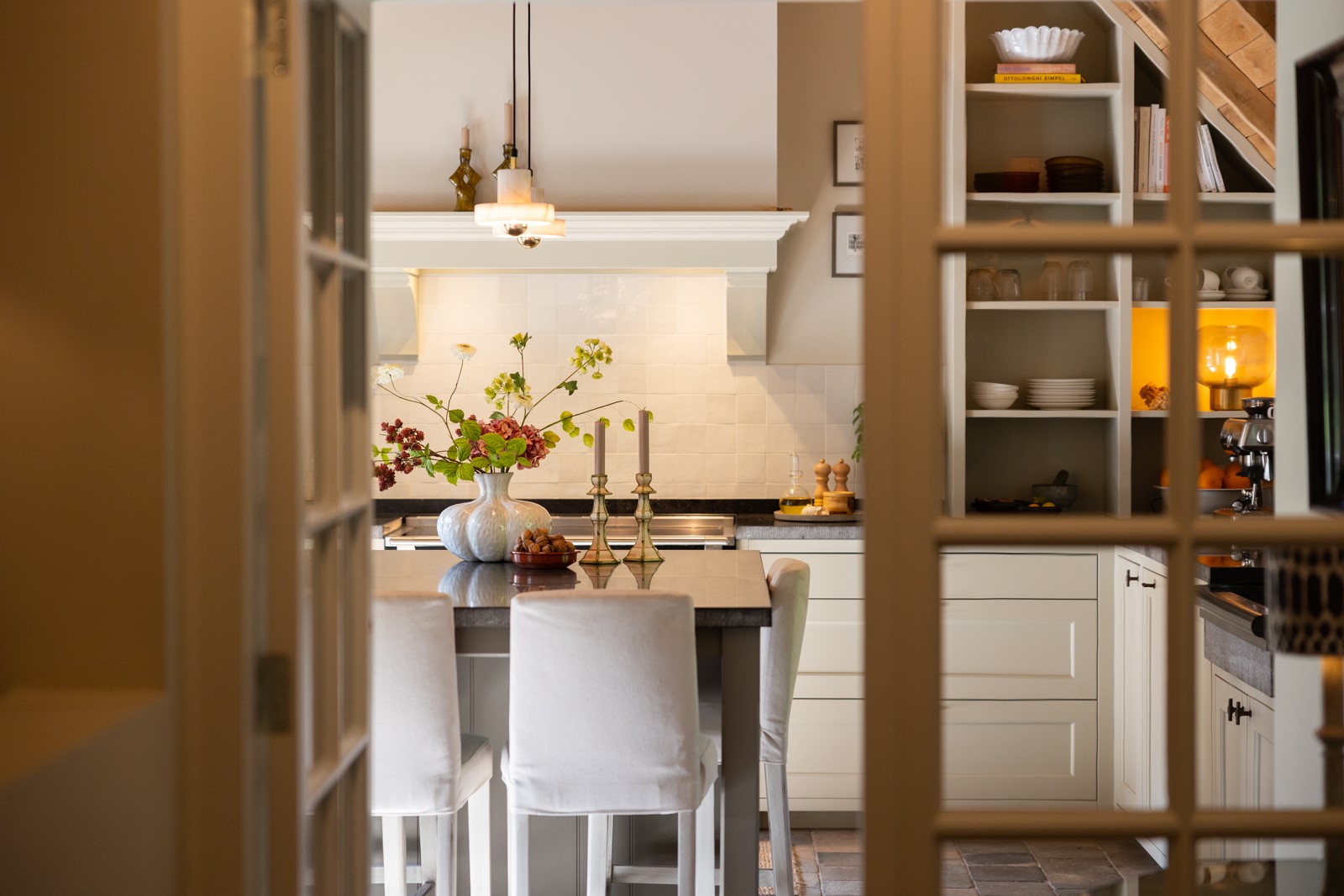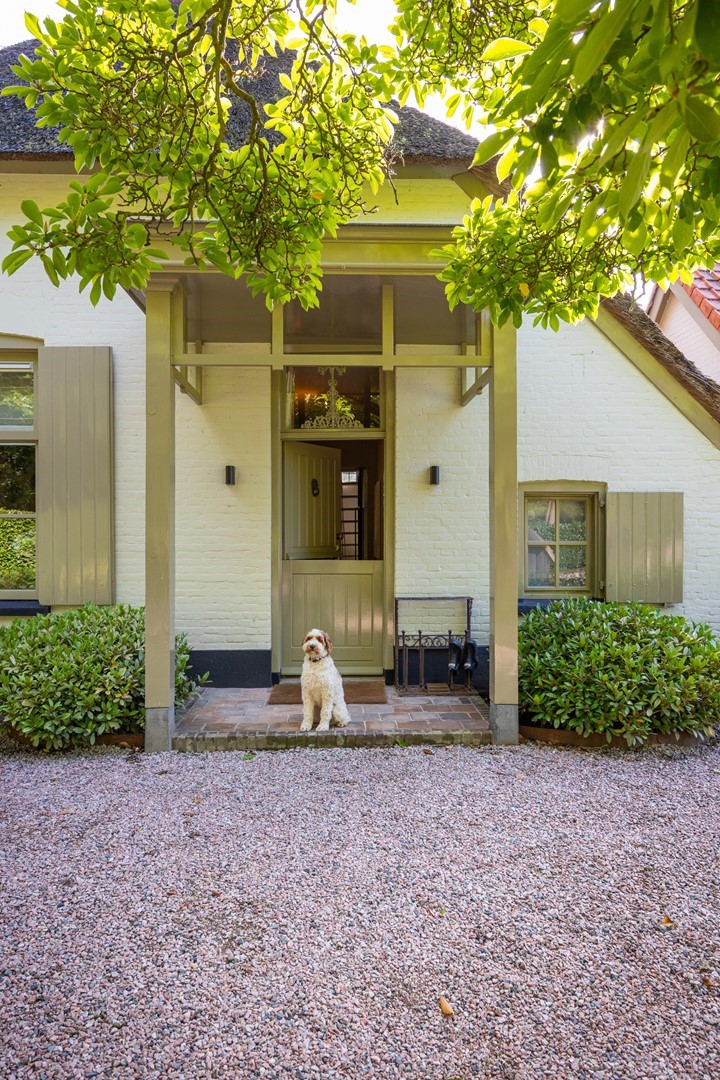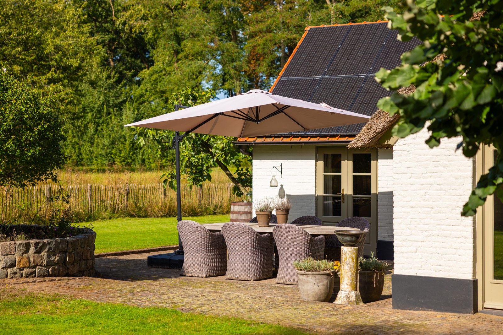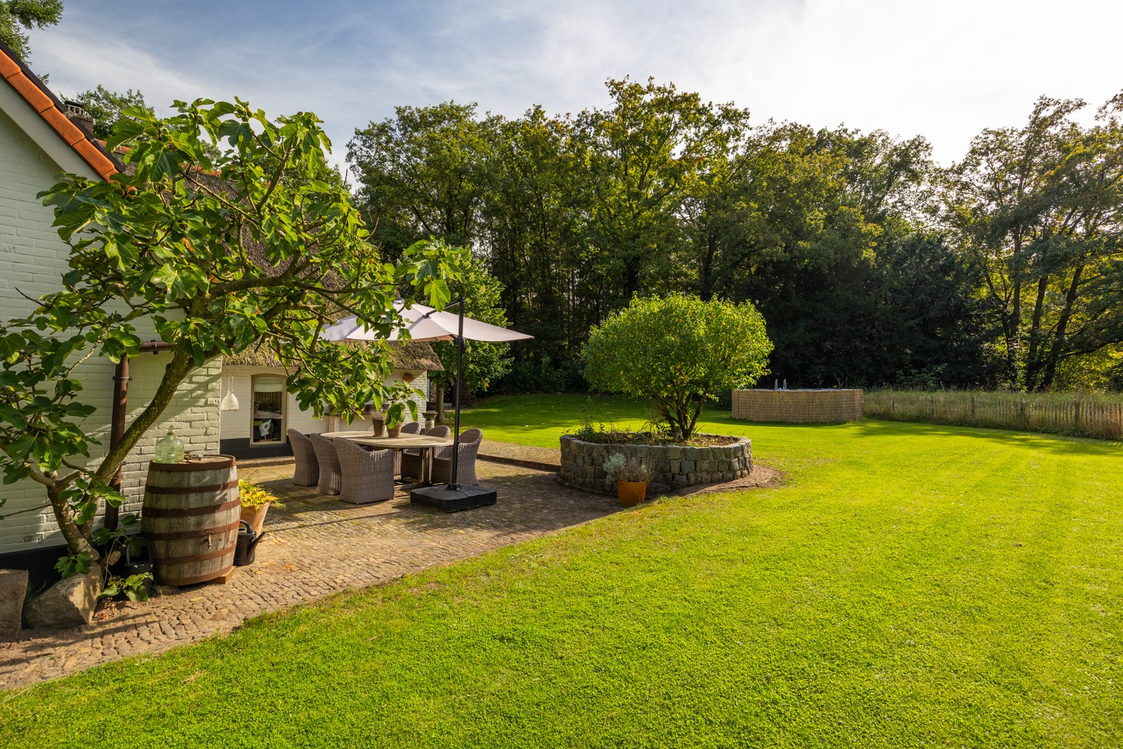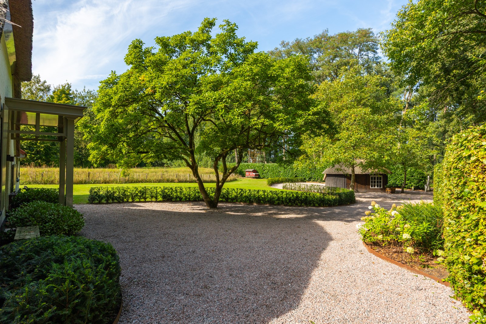 U parkeert achter het witte hek op het grind. De entree ligt in de schaduw van een grote magnolia. Binnen springt de stijlvol gerestaureerde opkamer direct in het oog. De aangrenzende maatwerkkeuken met Falconfornuis (inductie) is haast professioneel uitgerust. In de woonkamer contrasteren strak gestucte wanden met de ‘nostalgische’, nieuw gemaakte balken en hildes. Stalen deuren zorgen voor ruimtelijkheid. De HR Barbas houtkachel zorgt voor warmte in de winter; in de zomer biedt – net als vroeger - de leilinde schaduw. U ziet en voelt dat alles in en om dit thuis tot in detail is doordacht en met alleen de allerbeste materialen werd uitgevoerd.