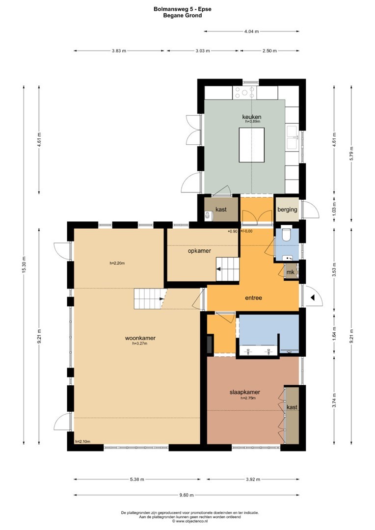 Begane grond: Hal. Entree. Toilet. Woonkamer met trap naar 1e verdieping. Woonkeuken. Opkamer. Masterbedroom met badkamer en suite. Badkamer met dubbele wastafel en inloopdouche.
