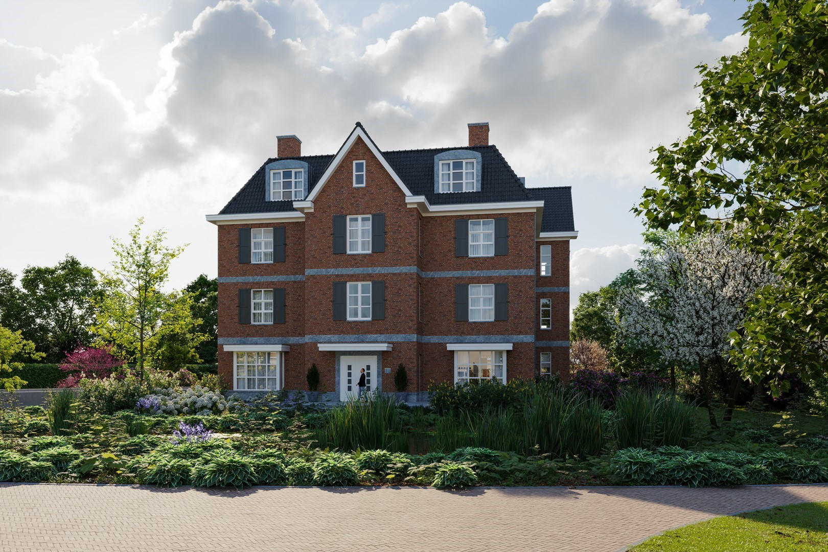 Rondom Villa Bosse ligt een monumentale tuin in Engelse landschapsstijl. Geen strak grid, maar een natuurlijk ogende compositie met zichtlijnen, glooiingen en gelaagde beplanting. Bomen zorgen voor hoogte en schaduw, daaronder heesters, bloeiende struiken en vaste planten. Zelfs in de winter blijft de tuin levendig, dankzij wintergroene beplanting die structuur en kleur geeft aan de koudste maanden van het jaar. De tuin is niet alleen iets om naar te kijken, maar ook om in te leven. Een plek waar privacy samengaat met verbondenheid. Elke zone, van het entreegebied tot de parkzone heeft een eigen sfeer en functie.