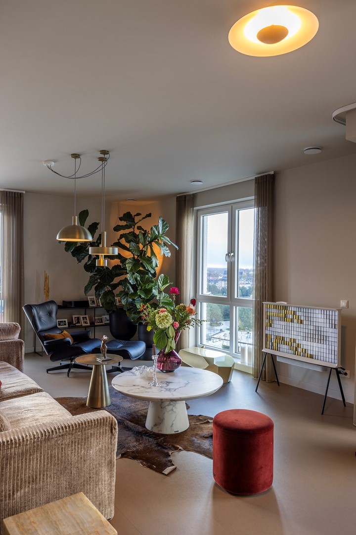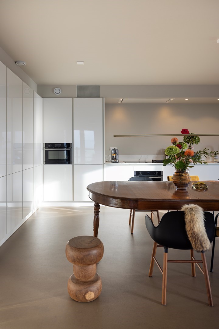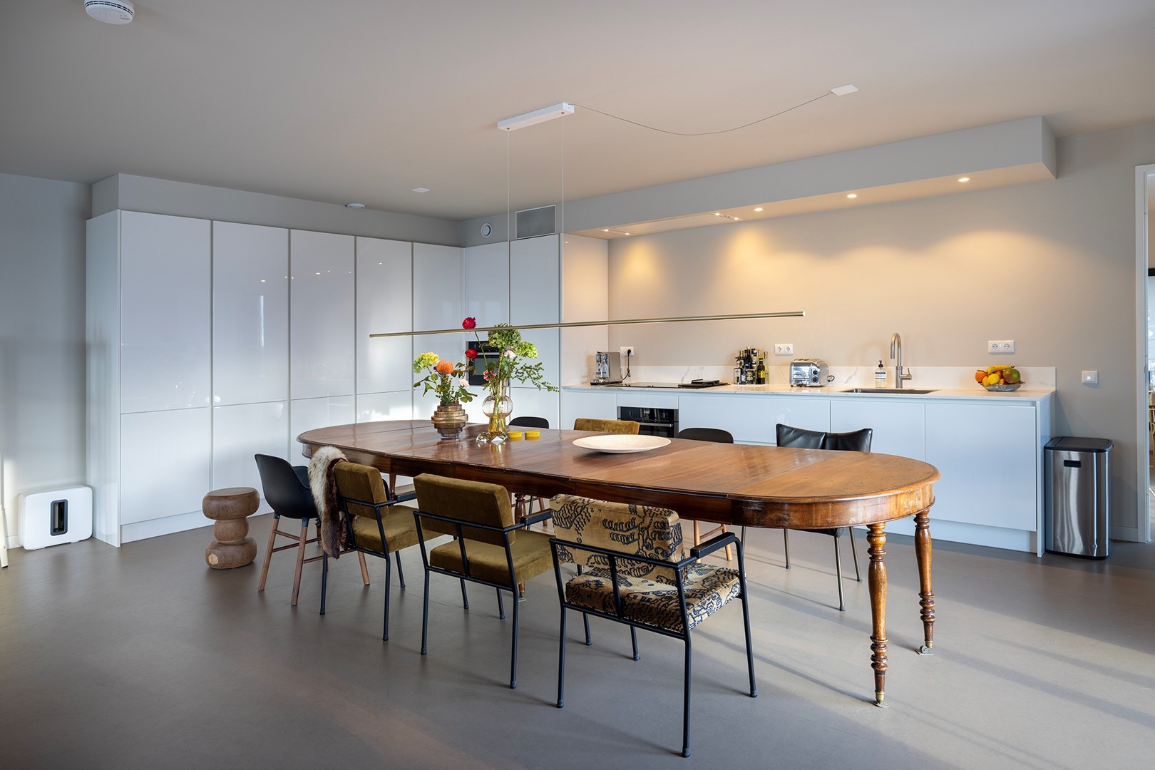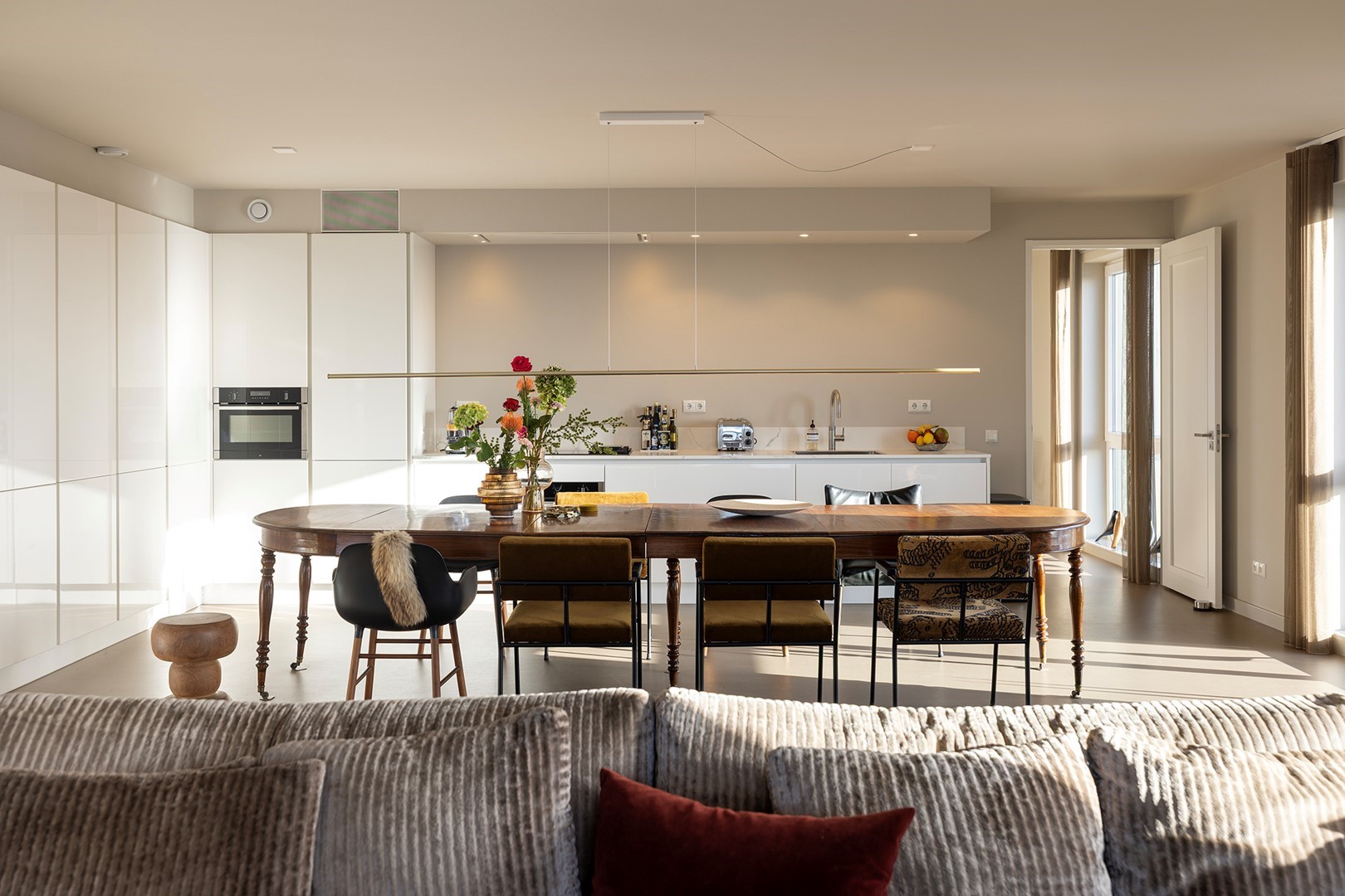 De woonkamer vormt het kloppend hart van het appartement en is een ware eyecatcher. Dankzij de grote raampartijen geniet u hier van een fenomenaal uitzicht in elke richting. Via openslaande deuren bereikt u het ruime, op het zuiden georiënteerde balkon. Hier kunt u in alle rust ontspannen met een goed glas wijn en de zon langzaam zien ondergaan. Op deze hoogte is er sprake van volledige rust en optimale privacy. In dezelfde ruimte bevindt zich de royale open keuken. Dankzij de opstelling en hoogwaardige afwerking ontstaat een bijzonder ruimtelijk gevoel. De keuken is uitgerust met veel kastruimte en voorzien van moderne inbouwapparatuur zoals een inductiekookplaat, combi-oven-magnetron, een aparte oven, koelkast en vriezer.